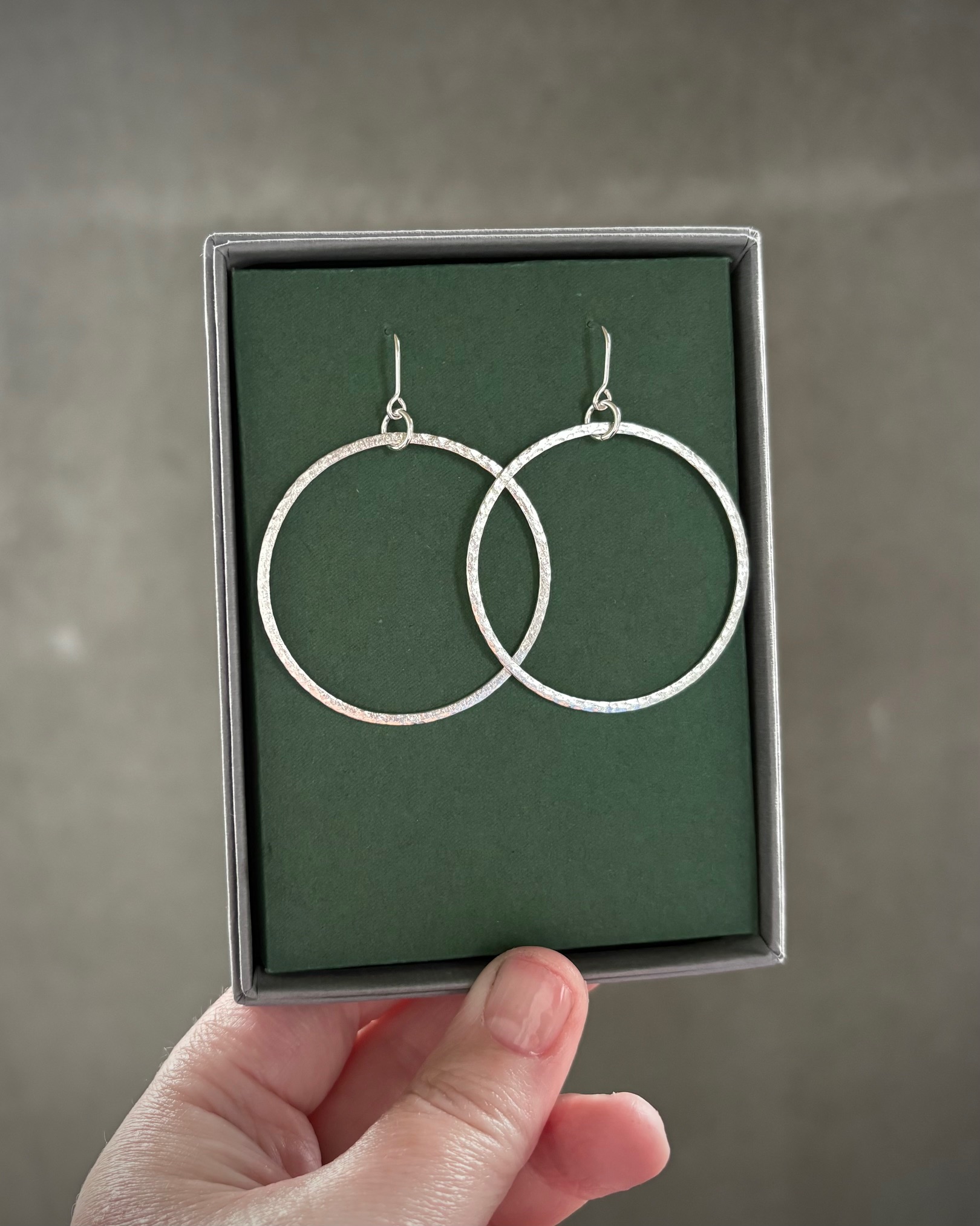 Hammered silver hoops made from recycled silver 925. Handmade in Helsinki.