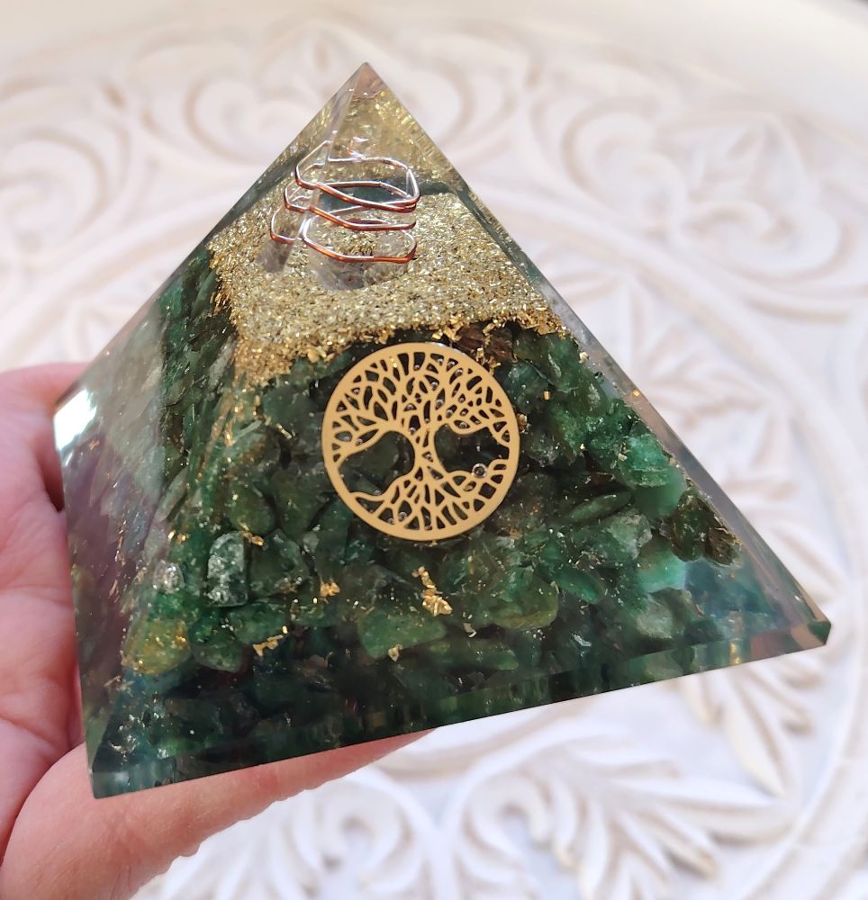 Kaunis orgoniitti, jossa orgaaninen ainesosa sisältää hartsia ja vihreää aventuriinia, ei orgaaninen ainesosa metallia eli tässä pyramidissa on kuparihiukkasia ja kuparilankaa. Kärkenä kvartsikide. Pyramidissa on myös kullanvärinen elämänpuu symboli. Käytä tätä orgoniitti pyramidia tuomaan sinulle hyvää onnea, houkuttamaan vaurautta sekä menestystä uralla. Vihreä aventuriini purkaa myös negatiivisia tilanteita, se värähtelee sydänchakran kanssa.
