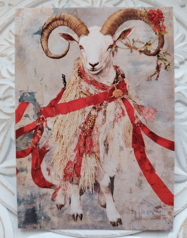 Postikortti (A6) kokoinen kortti Vuodenpyörä 2026 kalenterin kuvituskuvasta, jonka nimi on "Yule-pukki".