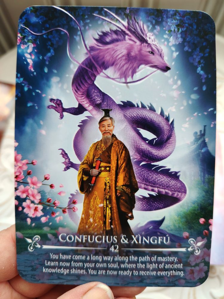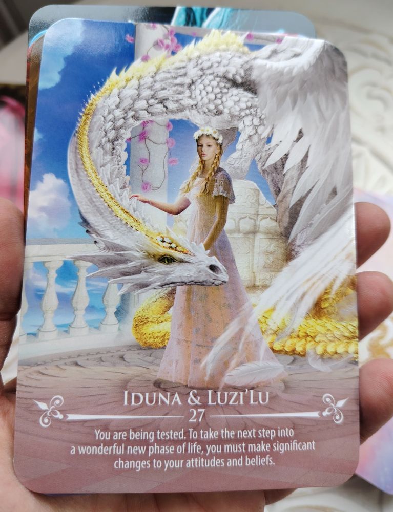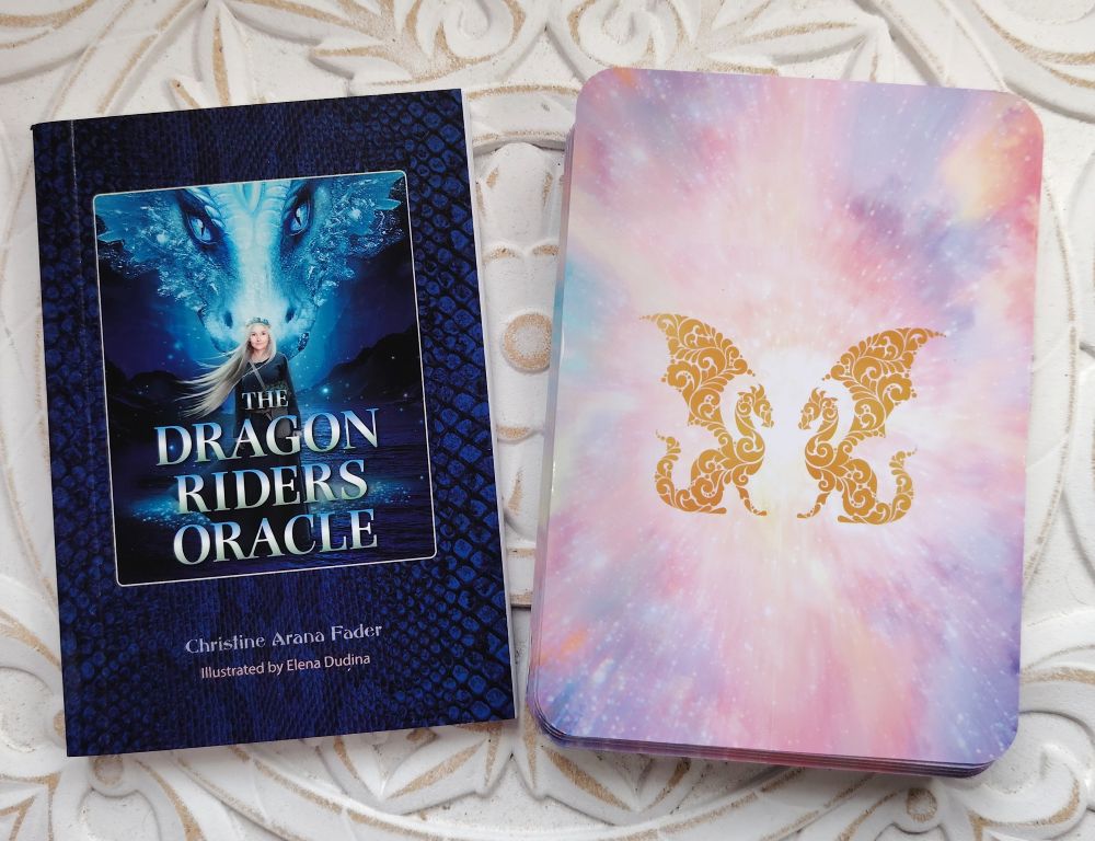 "Dragons, the oldest creatures in our universe, have accompanied gods, goddesses, planets, angels, elves, and ascended masters through the ages. Together these pairings of dragon and dragon rider create powerful energetic fields that can support us on our way to higher levels of consciousness. You will connect with dragon riders from all times, countries, and cultures, such as Kuan Yin, Archangel Michael, Mother Mary, planet god Mars, the Celtic goddess Ceridwen, and Mother Earth, along with their ancient dragon companions. The deck also includes two joker cards, featuring cats, which, like dragons, magically connect our world to the spirit world. The jokers indicate a great opportunity at hand and, instead of a message, they offer a ritual to support you in making the leap to the next level".