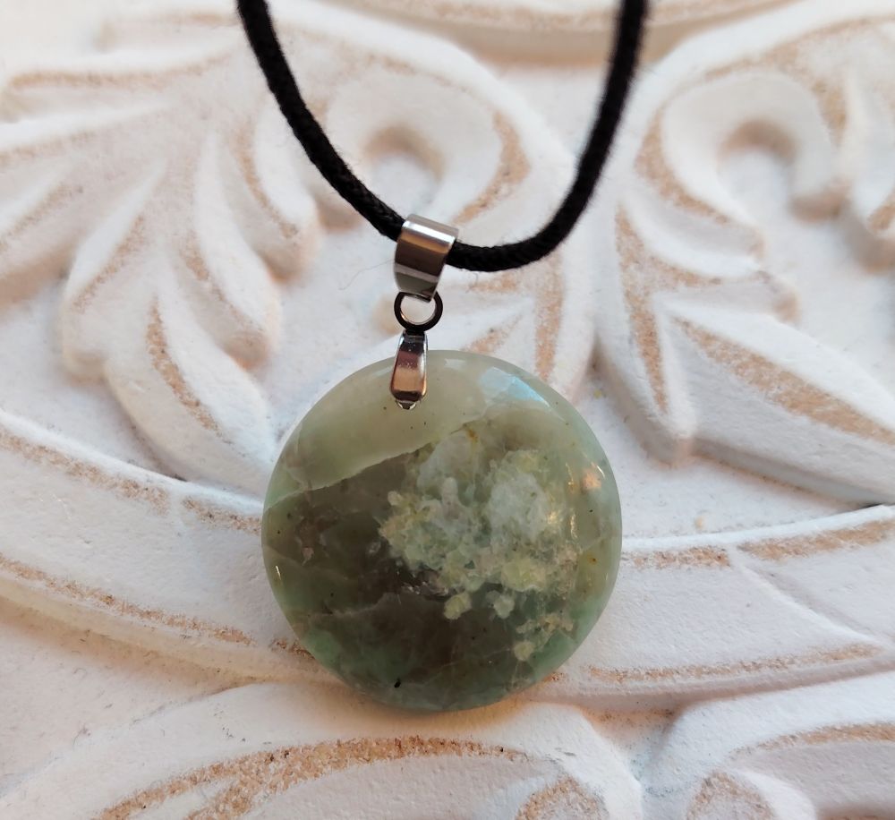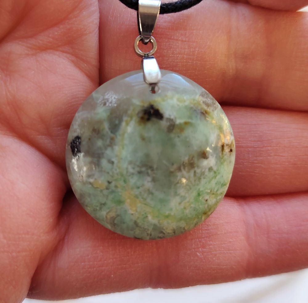 Pulleahko täydenkuun muotoinen kiviriipus, joka on tehty vihreästä kuukivestä. Olen kuvannut ja numeroinut jokaisen erikseen eli saat itsellesi kuvassa näkyvän korun. Tämä täysikuu on halkaisijaltaan 2,5 cm. Tässä mallissa kumpi puoli tahansa soveltuu etupuoleksi. Laitan riipuksen mukaan mustaa vahattua nyörinauhaa, josta voit solmia itsellesi sopivan mittaisen nauhan. Tähän koruun voi vaihtaa oman sopivan ketjun esim nahkanyörin tai hopeaketjun. Kyseessä on hyvälaatuinen kiviriipus, jonka on valmistanut käsityönä Madagaskarin artesaaniyhteisö.