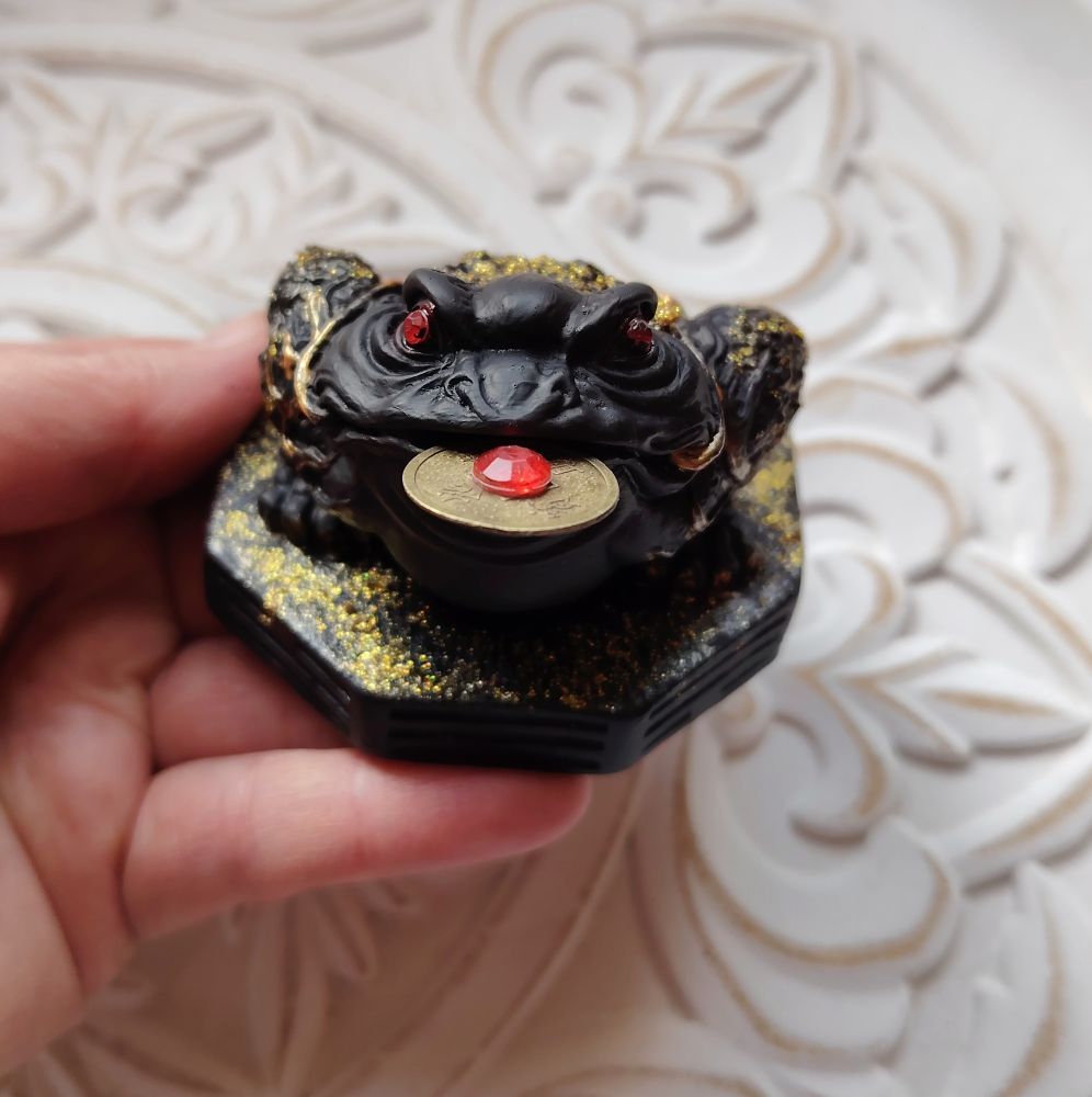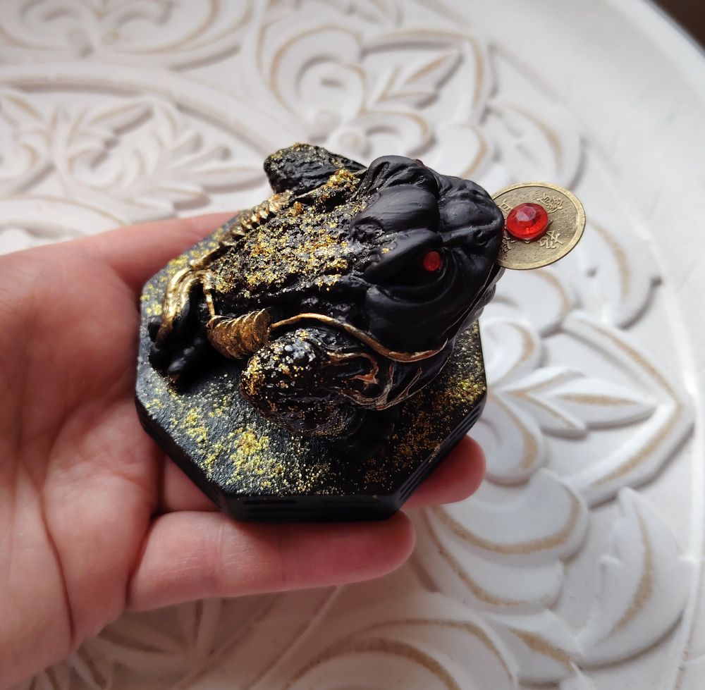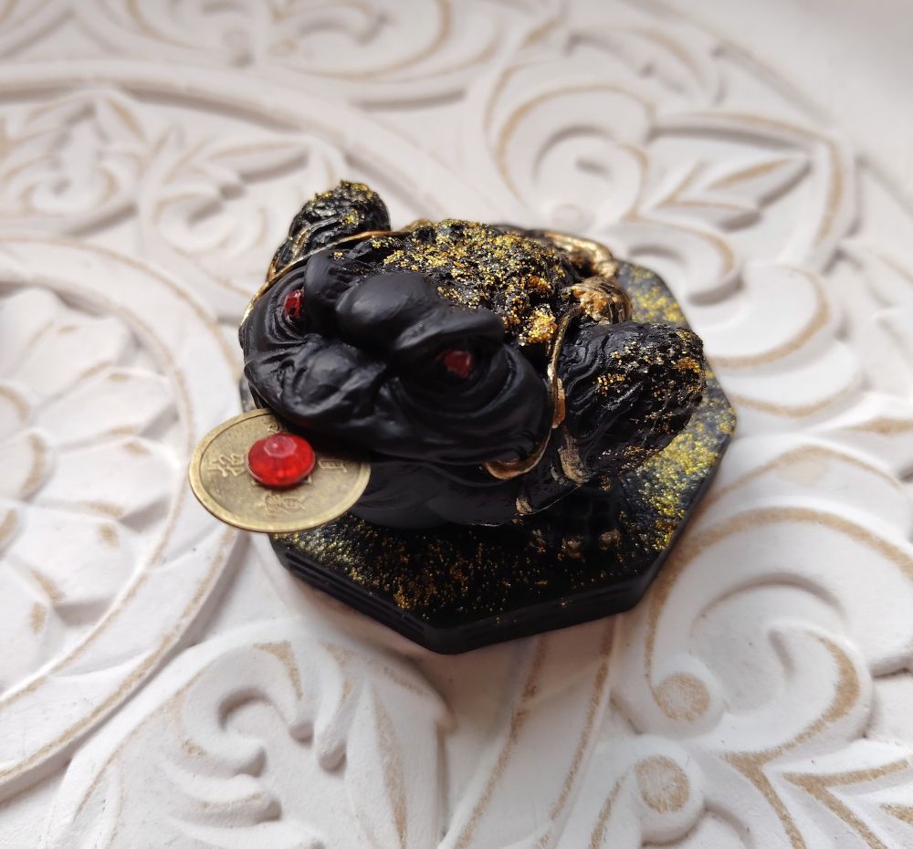 Nämä suloiset rahasammakot ovat Katin omaa mallistoa. Tämä sammakko on musta, johon lisäsin kultaa ja kultahilettä. Feng Shuissa kulta symboloi vaurautta. Vauraussammakolla on irrallinen raha suussa.