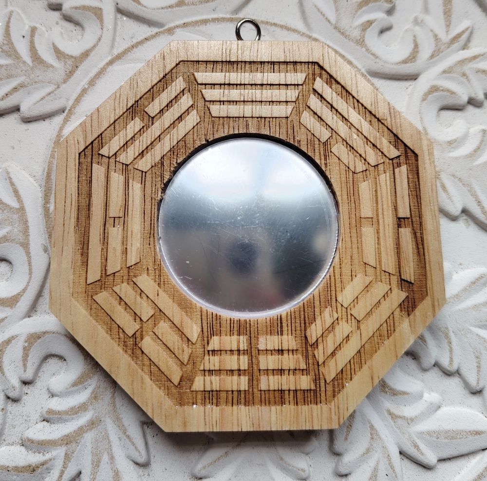 Tuotteesta: tämä peili on kupera malli, halkaisija 10,5 cm. Valmistettu puusta. Valmis ripustus ylhäällä, jotta tiedät mikä trigrammi on ylhäällä. Huomioithan että tässä peilissä kupera pinta on heijastavaa materiaalia ei oikeaa peiliä.