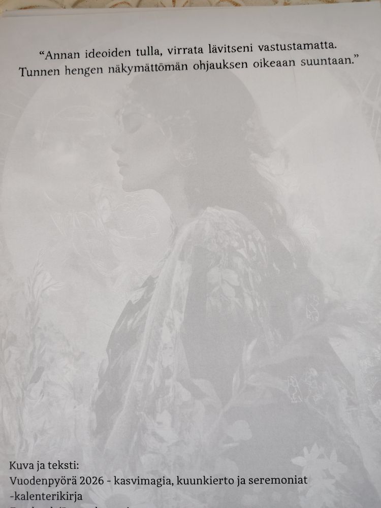 Takana kuva mustavalkoisena sekä teksti "Annan ideoiden tulla, virrata lävitseni vastustamatta. Tunnen hengen näkymättömän ohjauksen oikeaan suuntaan."