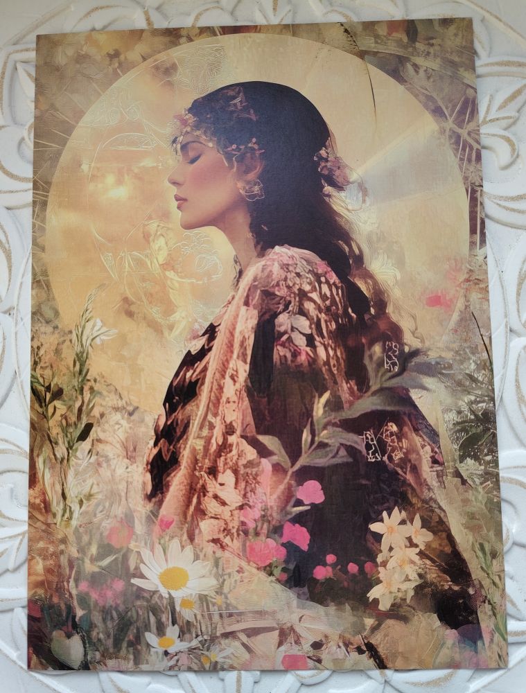 Iso kortti (A4) Vuodenpyörä 2026 kalenterin huhtikuun kuvituskuvasta "Kevään valo". Kaunis vaikka tauluksi tai omalle alttarille.