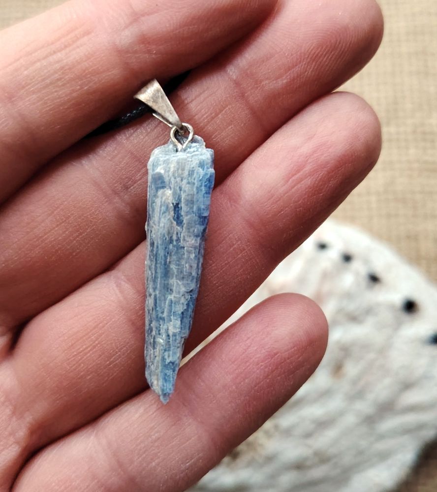 Raakapala sinistä kyaniittia, joka on tehty koruksi. Mukaan saat vahattua mustaa nyörinauhaa, joka on solmittava ja sen pituus on n. 80 cm. Fiksaa nyöriä lyhyemmäksi tai vaihda koruun esim. hopeaketju. Jokainen kivi koruissa on hieman eri muotoinen luonnollisten ominaisuuksien vuoksi. Ostaessasi korun, saat kuvassa näkyvän yksilön. Koko on n. 0,80 cm x 3,5 cm. PS: tämä kivikoru on kooltaan pieni.