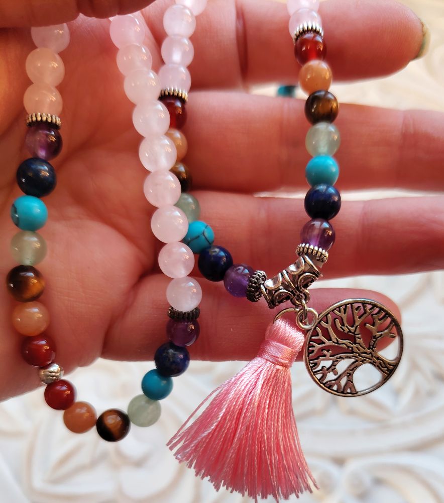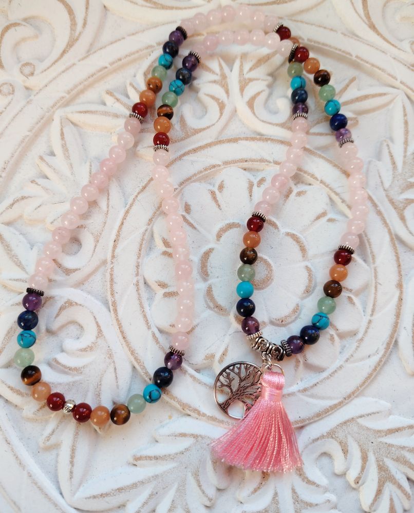 Kaunis mala, jossa on kivenä ruusukvartsi, lisäksi välissä joka chakran kivet. 7 chakran kivet ovat Jasper, kalsiitti, tiikerinsilmä, aventuriini, turkoosi, sodaliitti, ametisti. Malassa on kaunis elämänpuu symboli ja vaaleanpunainen tupsu. Joustava nauha eli voit käyttää tätä joko kaulassa tai ranteessa. Malan koko pituus on 66cm, jos pidät kaulassa niin ylhäältä alas oleva mitta on 33cm + tupsu. Malassa on 108 helmeä ja niiden koko on 60 mm.