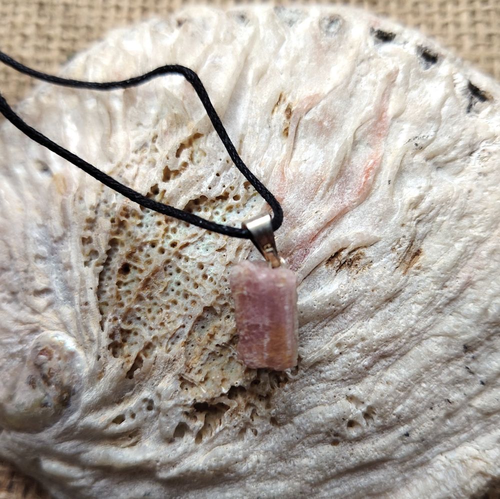 Raakapala vaaleanpunaista turmaliinia, joka on tehty koruksi. Mukaan saat vahattua mustaa nyörinauhaa, joka on solmittava ja sen pituus on n. 80 cm. Fiksaa nyöriä lyhyemmäksi tai vaihda koruun esim. hopeaketju. Jokainen kivi koruissa on hieman eri muotoinen luonnollisten ominaisuuksien vuoksi. Ostaessasi korun, saat kuvassa näkyvän yksilön. Koko on n. 1 cm x 1,5 cm. PS: tämä kivikoru on kooltaan pieni.