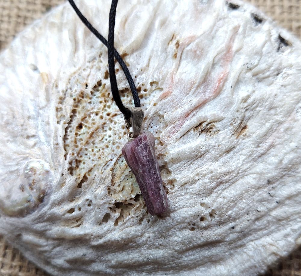Raakapala vaaleanpunaista turmaliinia, joka on tehty koruksi. Mukaan saat vahattua mustaa nyörinauhaa, joka on solmittava ja sen pituus on n. 80 cm. Fiksaa nyöriä lyhyemmäksi tai vaihda koruun esim. hopeaketju. Jokainen kivi koruissa on hieman eri muotoinen luonnollisten ominaisuuksien vuoksi. Ostaessasi korun, saat kuvassa näkyvän yksilön. Koko on n. 1 cm x 2 cm. PS: tämä kivikoru on kooltaan pieni.