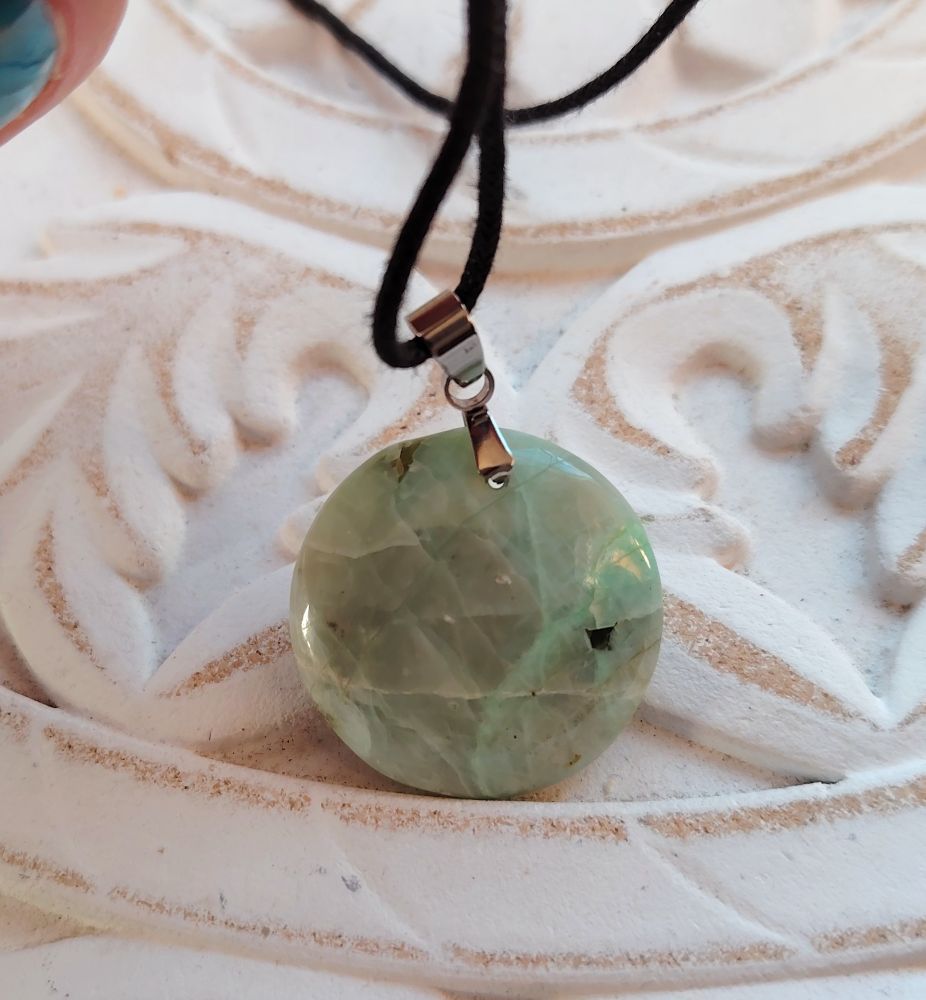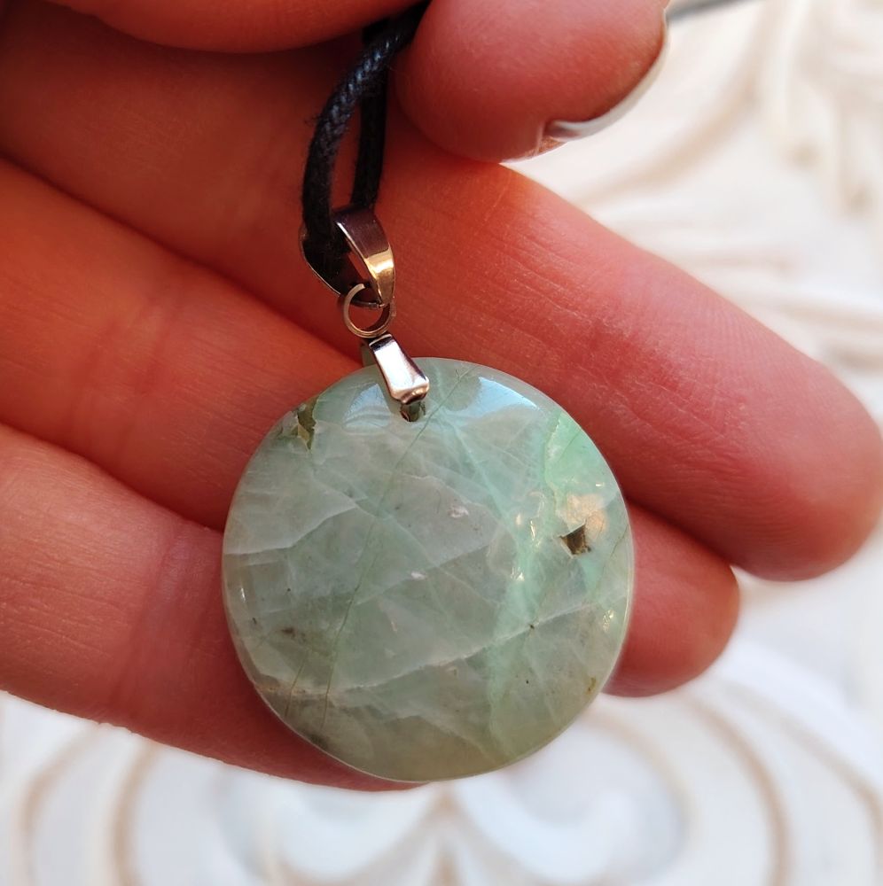 Pulleahko täydenkuun muotoinen kiviriipus, joka on tehty vihreästä kuukivestä. Olen kuvannut ja numeroinut jokaisen erikseen eli saat itsellesi kuvassa näkyvän korun. Tämä täysikuu on halkaisijaltaan 2,5 cm. Tässä mallissa kumpi puoli tahansa soveltuu etupuoleksi. Laitan riipuksen mukaan mustaa vahattua nyörinauhaa, josta voit solmia itsellesi sopivan mittaisen nauhan. Tähän koruun voi vaihtaa oman sopivan ketjun esim nahkanyörin tai hopeaketjun. Kyseessä on hyvälaatuinen kiviriipus, jonka on valmistanut käsityönä Madagaskarin artesaaniyhteisö.