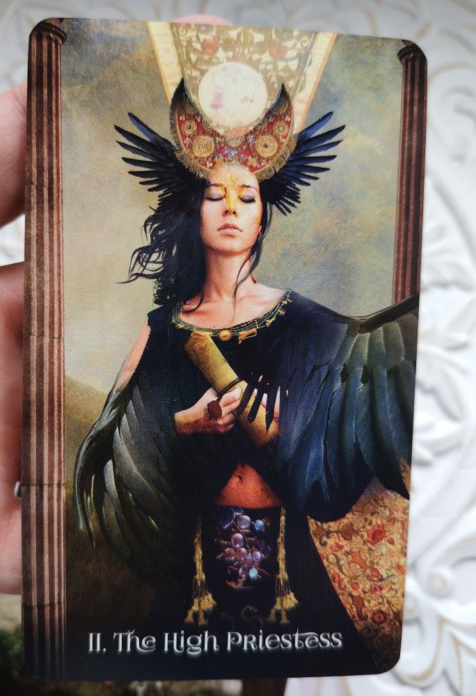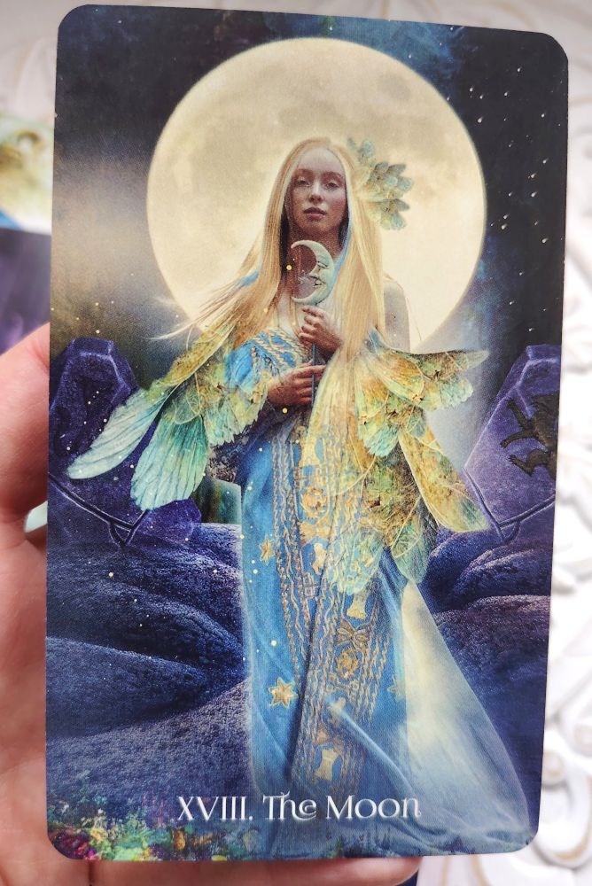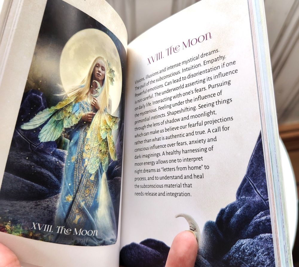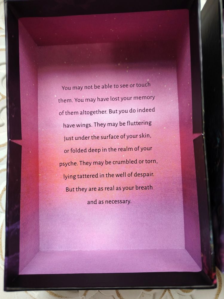 Lisätietoja: kaunis kovakantinen rasia, jossa on myös sisällä inspiraatiokuva ja teksti. Korttien reunuksissa on violetti kultaus. Pakan mukana tulee organza pussukka, jossa kortteja voi säilyttää. Huikean paksu 198-sivuinen opaskirja.