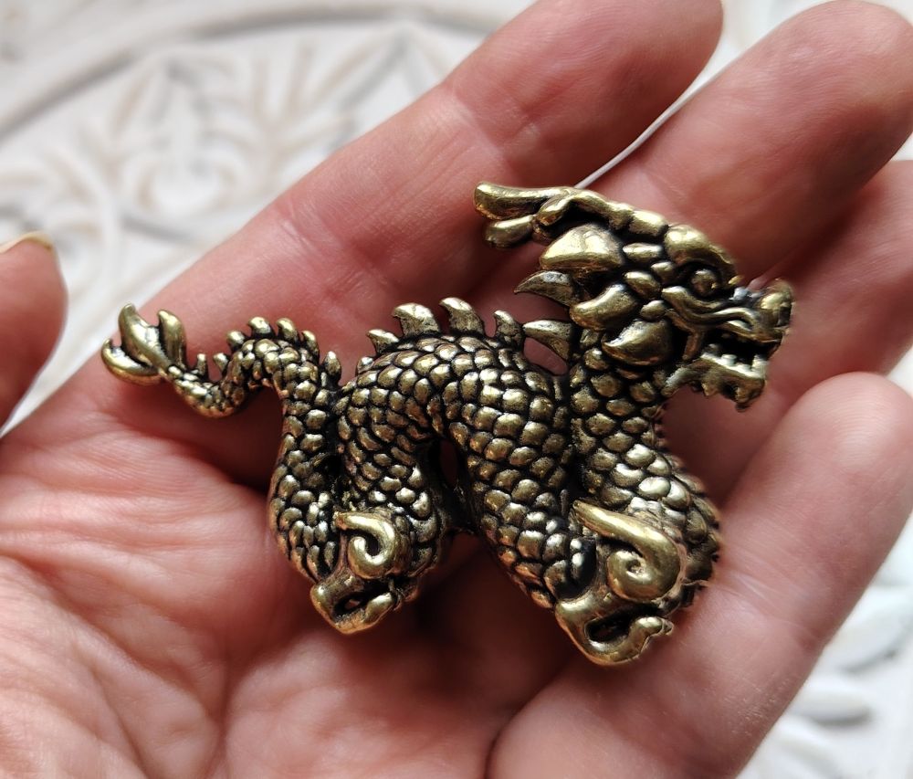 Tuotteesta: Tämä lohikäärme on kooltaan pieni, valmistettu pronssista, väri on kulta (antiikkikulta). Koko: pituus 6 cm x korkeus 3,5 cm. Syvyys 2,5 cm.