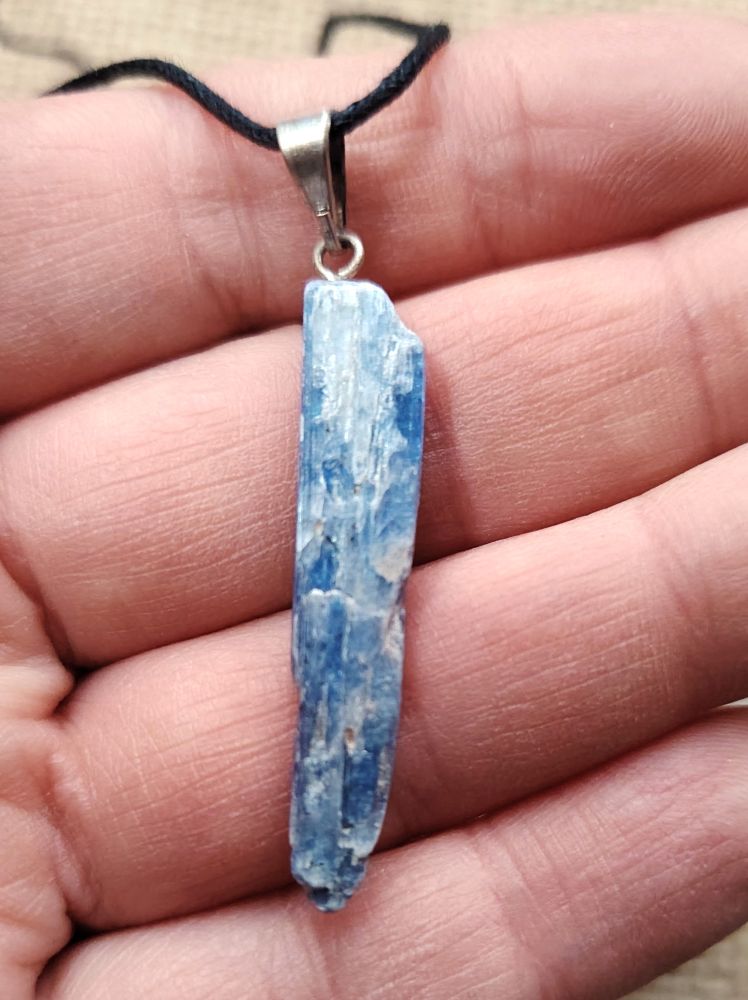 Raakapala sinistä kyaniittia, joka on tehty koruksi. Mukaan saat vahattua mustaa nyörinauhaa, joka on solmittava ja sen pituus on n. 80 cm. Fiksaa nyöriä lyhyemmäksi tai vaihda koruun esim. hopeaketju. Jokainen kivi koruissa on hieman eri muotoinen luonnollisten ominaisuuksien vuoksi. Ostaessasi korun, saat kuvassa näkyvän yksilön. Koko on n. 0,80 cm x 4 cm. PS: tämä kivikoru on kooltaan pieni.