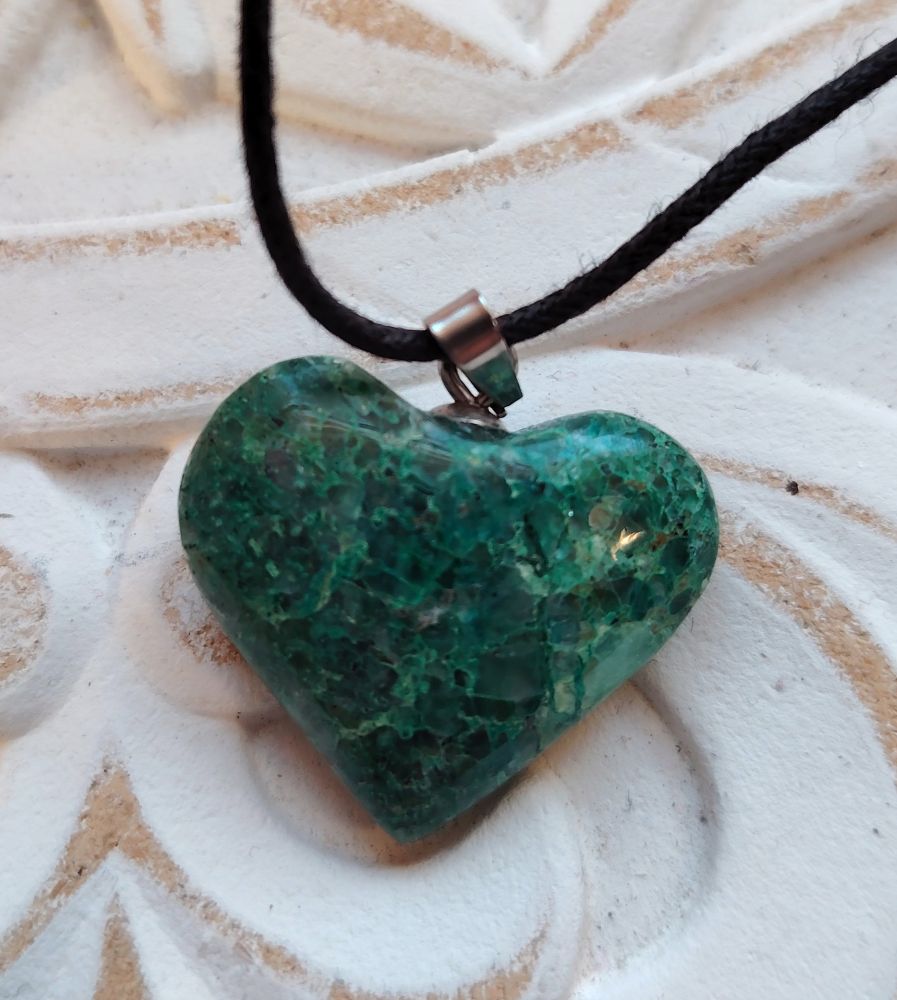 Pulleahko sydämen muotoinen kiviriipus, joka on tehty krysokollasta. Olen kuvannut ja numeroinut kaikki erikseen eli saat itsellesi kuvassa näkyvän korun. Tämä sydän on pienehkö eli koko 2,4 cm x 2,4 cm. Tässä mallissa kumpi puoli tahansa soveltuu etupuoleksi. Laitan riipuksen mukaan mustaa vahattua nyörinauhaa, josta voit solmia itsellesi sopivan mittaisen nauhan. Tähän koruun voi vaihtaa oman sopivan ketjun esim nahkanyörin tai hopeaketjun. Kyseessä on hyvälaatuinen kiviriipus, jonka on valmistanut käsityönä Madagaskarin artesaaniyhteisö