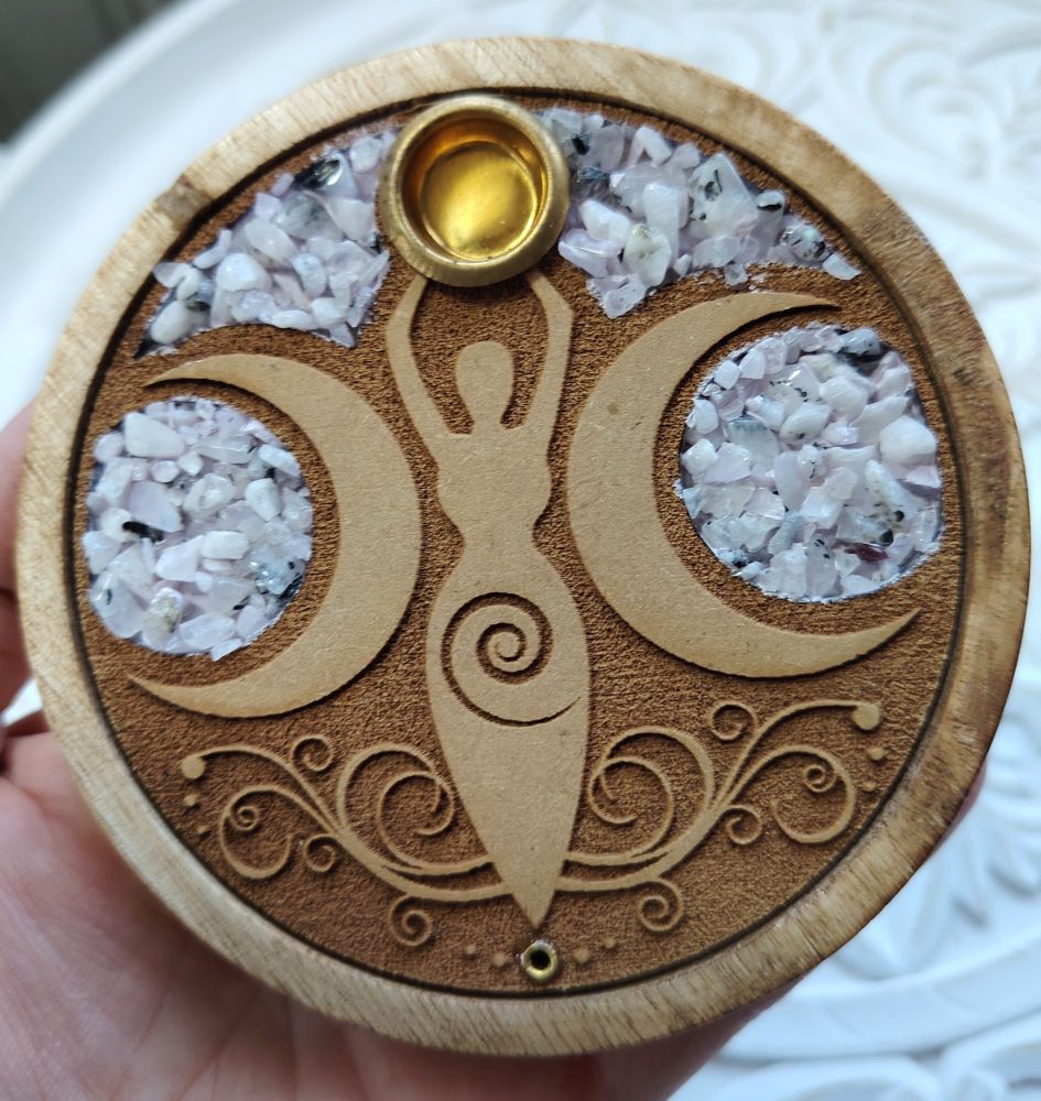ovh 14.90€-40% => 8,94 Kaunis suitsuketeline, jossa on kuviona Kuun Jumalatar ja koristeena kuukiviä. Tämä on tarkoitettu normaaleille suitsuketikuille esim. Ispalla ja Organic Goodness suitsukkeet sekä tässä mallissa voi polttaa myös kartiosuitsukkeita.