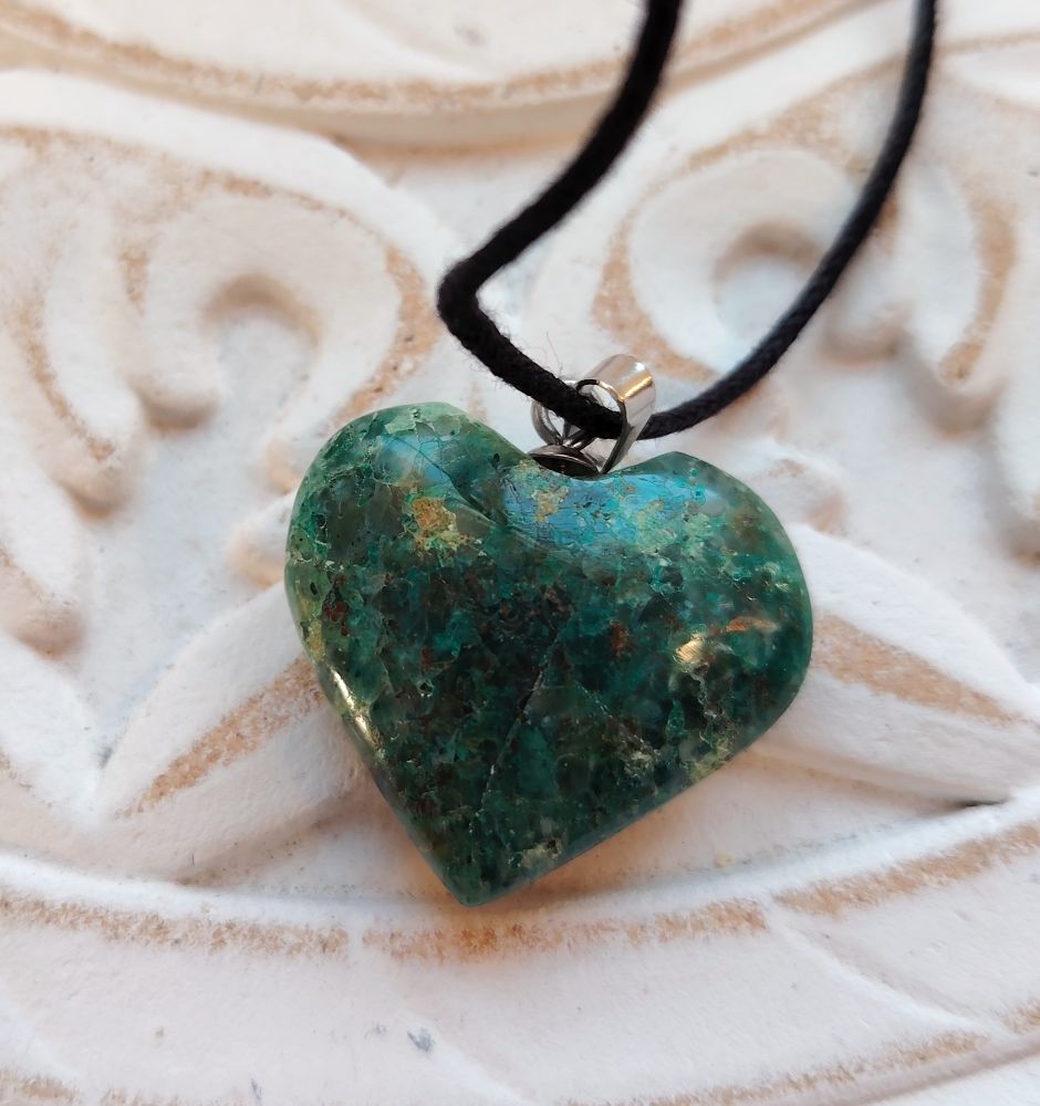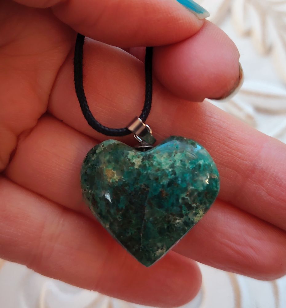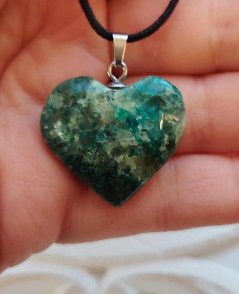 Pulleahko sydämen muotoinen kiviriipus, joka on tehty krysokollasta. Olen kuvannut ja numeroinut kaikki erikseen eli saat itsellesi kuvassa näkyvän korun. Tämä sydän on pienehkö eli koko 2,4 cm x 2,4 cm. Tässä mallissa kumpi puoli tahansa soveltuu etupuoleksi. Laitan riipuksen mukaan mustaa vahattua nyörinauhaa, josta voit solmia itsellesi sopivan mittaisen nauhan. Tähän koruun voi vaihtaa oman sopivan ketjun esim nahkanyörin tai hopeaketjun. Kyseessä on hyvälaatuinen kiviriipus, jonka on valmistanut käsityönä Madagaskarin artesaaniyhteisö