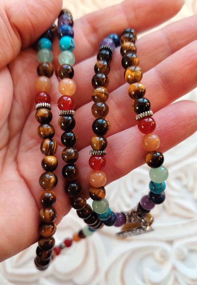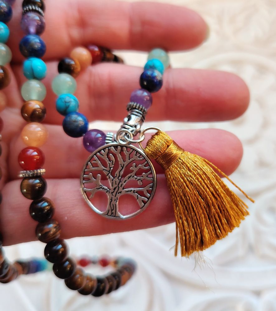 Kaunis mala, jossa on kivenä tiikerinsilmä, lisäksi välissä joka chakran kivet. 7 chakran kivet ovat Jasper, kalsiitti, tiikerinsilmä, aventuriini, turkoosi, sodaliitti, ametisti. Malassa on kaunis elämänpuu symboli ja ruskea tupsu. Joustava nauha eli voit käyttää tätä joko kaulassa tai ranteessa. Malan koko pituus on 66cm, jos pidät kaulassa niin ylhäältä alas oleva mitta on 33cm + tupsu. Malassa on 108 helmeä ja niiden koko on 60 mm.