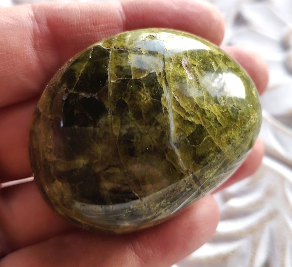 Pullea kämmenkivi, joka on ovaalin muotoinen. Saat itsellesi kuvassa näkyvän kiven. Kiven koko: 4 cm x 5 cm, paino 77 g.