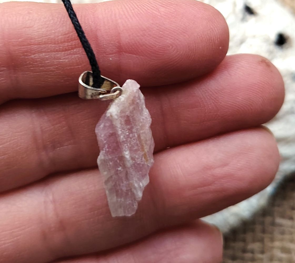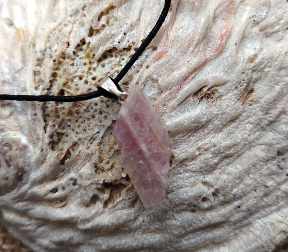 Raakapala vaaleanpunaista turmaliinia, joka on tehty koruksi. Mukaan saat vahattua mustaa nyörinauhaa, joka on solmittava ja sen pituus on n. 80 cm. Fiksaa nyöriä lyhyemmäksi tai vaihda koruun esim. hopeaketju. Jokainen kivi koruissa on hieman eri muotoinen luonnollisten ominaisuuksien vuoksi. Ostaessasi korun, saat kuvassa näkyvän yksilön. Koko on n. 1 cm x 2 cm. PS: tämä kivikoru on kooltaan pieni.