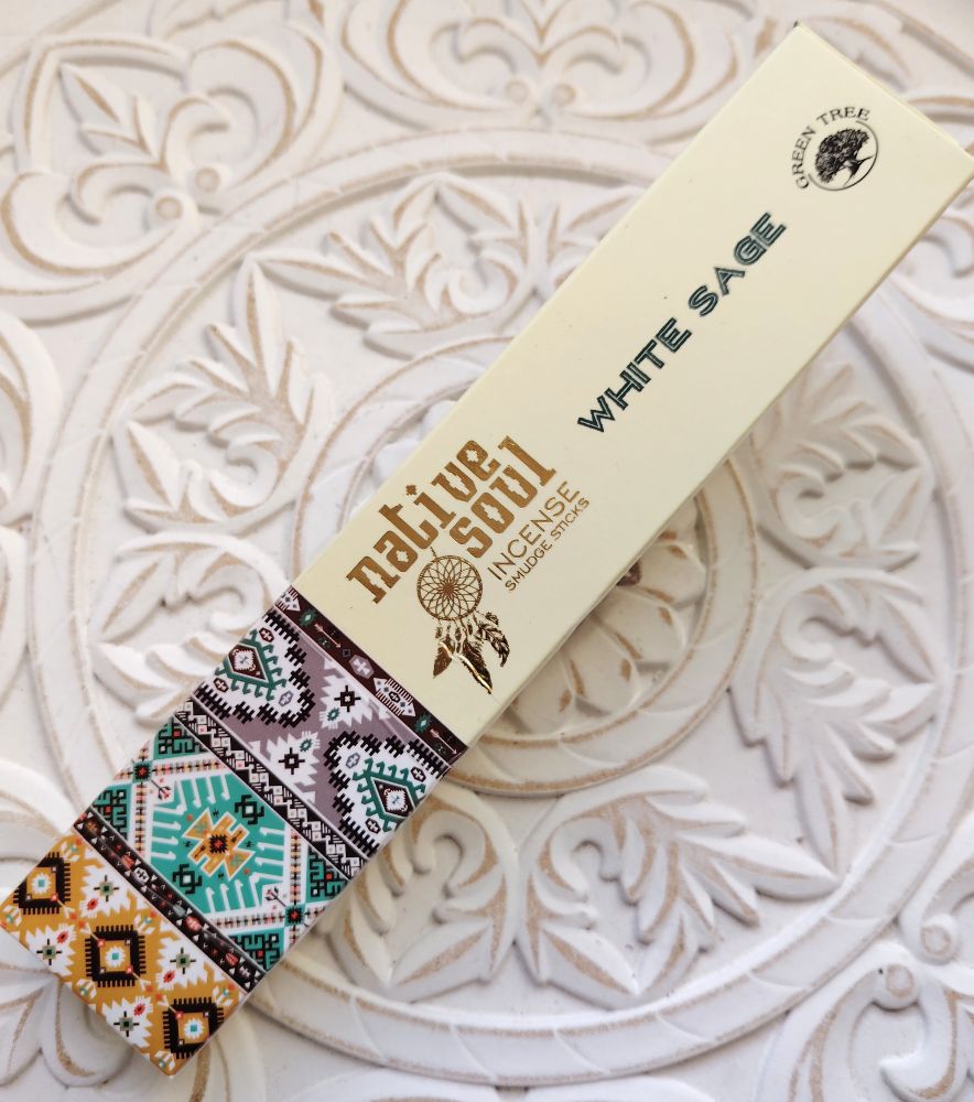 Kauniisti pakatut suitsuketikut, joissa tuoksuna valkoinen salvia. Käsinpyöritettyjä, eettisesti tuotettuja suitsukkeita.