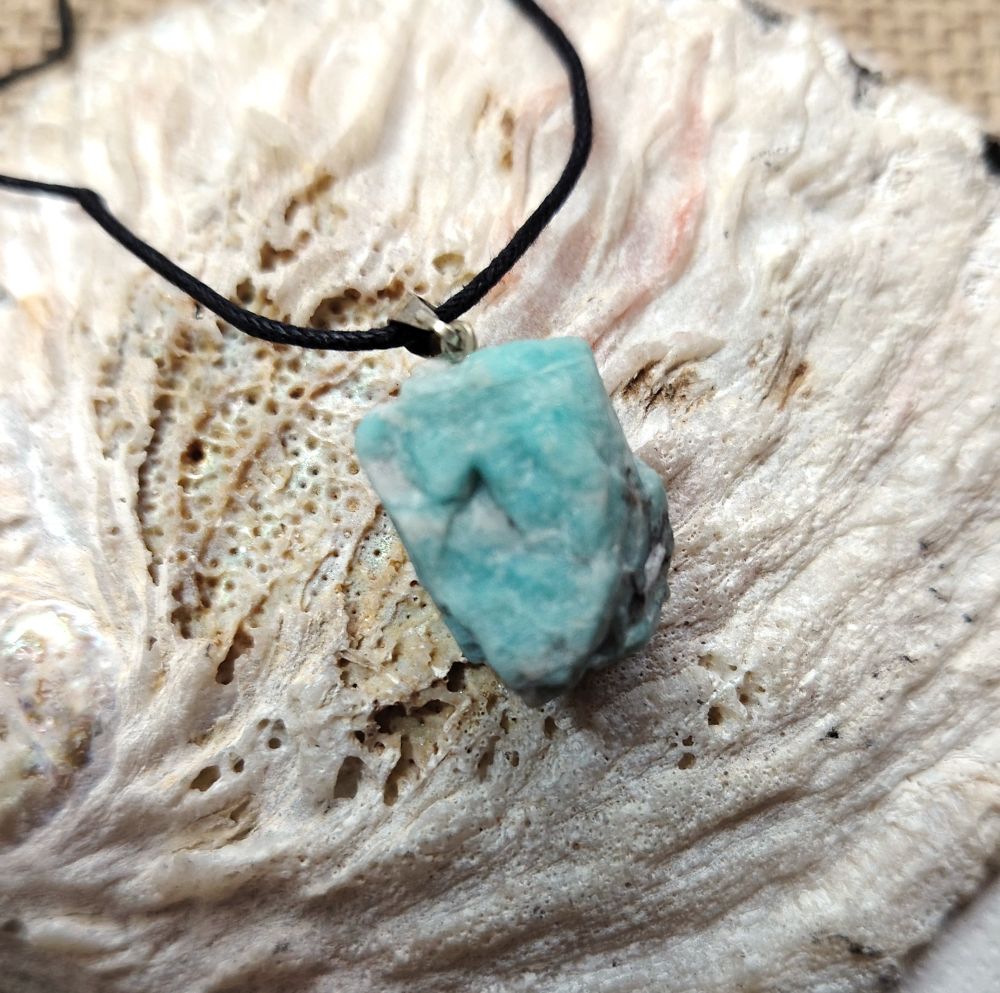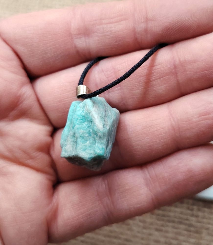 Raakapala amatsoniittia, joka on tehty koruksi. Mukaan saat vahattua mustaa nyörinauhaa, joka on solmittava ja sen pituus on n. 80 cm. Fiksaa nyöriä lyhyemmäksi tai vaihda koruun esim. hopeaketju. Jokainen kivi koruissa on hieman eri muotoinen luonnollisten ominaisuuksien vuoksi. Ostaessasi korun, saat kuvassa näkyvän yksilön. Koko on n. 1,5 cm x 2 cm. PS: tämä kivikoru on kooltaan pieni.