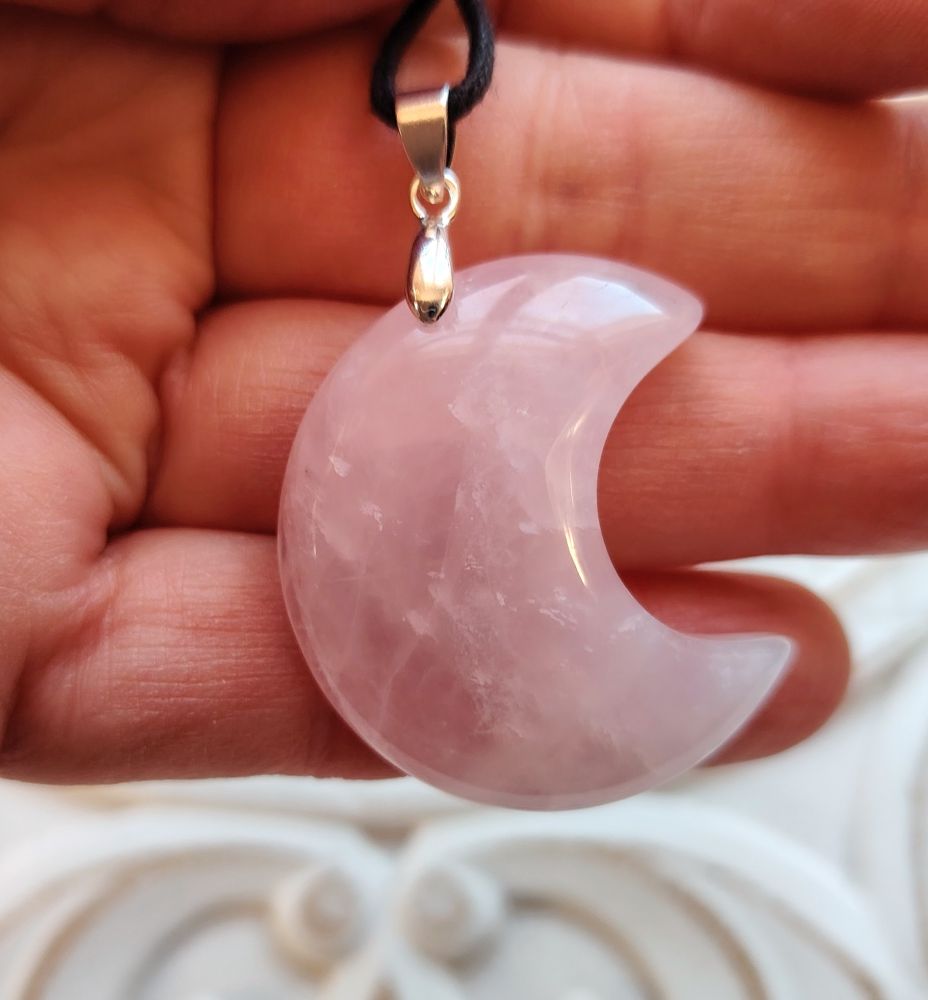 Kaunis puolikuun muotoinen kiviriipus, joka on tehty ruusukvartsista. Olen kuvannut ja numeroinut kaikki erikseen eli saat itsellesi kuvassa näkyvän korun. Koko 3 cm x 3,5 cm. Tässä mallissa toinen puoli on sileä eli pulleampi puoli on tarkoitettu etupuoleksi. Puolikuu on tällöin laskeva puolikuu. Laitan riipuksen mukaan mustaa vahattua nyörinauhaa, josta voit solmia itsellesi sopivan mittaisen nauhan. Tähän koruun voi vaihtaa oman sopivan ketjun esim nahkanyörin tai hopeaketjun. Kyseessä on hyvälaatuinen kiviriipus, jonka on valmistanut käsityönä Madagaskarin artesaaniyhteisö