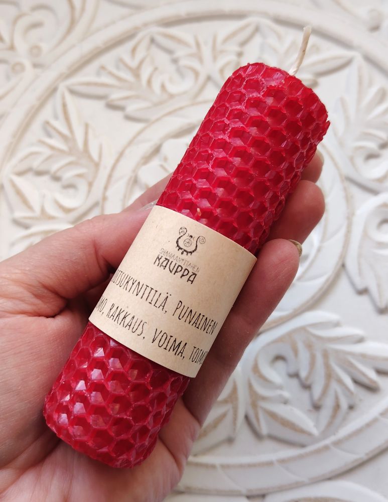 Punaiset kynttilät: intohimo, seksuaalisuus, voima, tuli elementti, ura, himo, toiminta, riippumattomuus, eloonjäänti. Punaista kynttilää voi polttaa jos tahtoo kasvattaa intohimoa elämään tai saada jonkun asian toimimaan nopeasti.