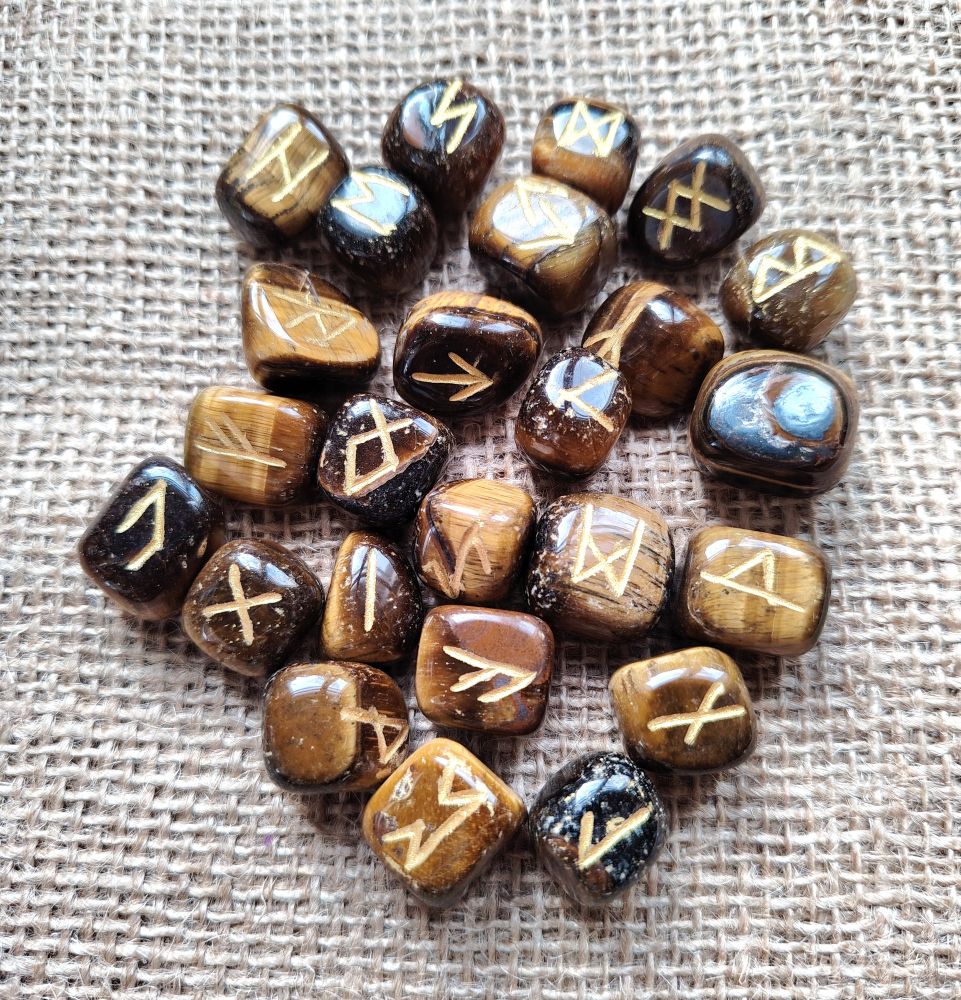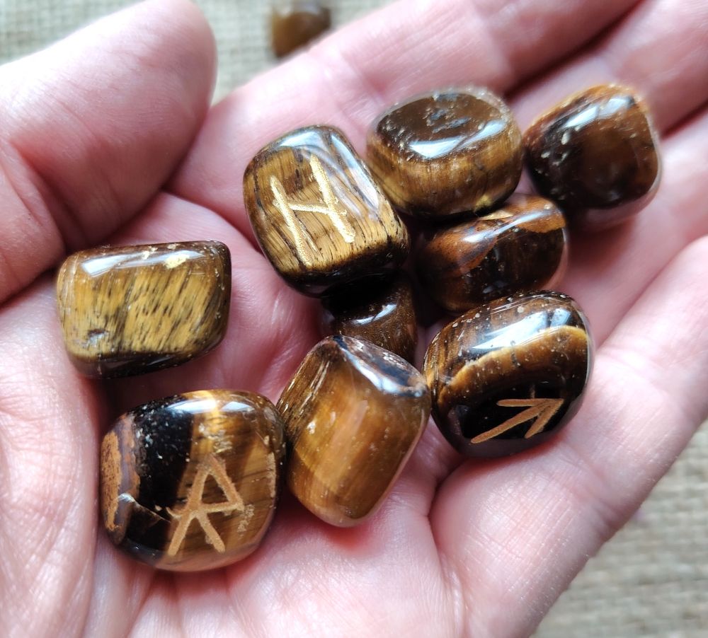 Nämä riimut ovat tiikerinsilmästä, joka on rohkeuden ja toiminnan kivi. Perinteisesti tiikerinsilmää on kannettu amulettina kirouksia ja pahantahtoisia ajatuksia vastaan. Se voi torjua ei toivotut ja negatiiviset energiat. Kivi antaa sinulle rohkeutta, itseluottamusta ja mielenlujuutta.