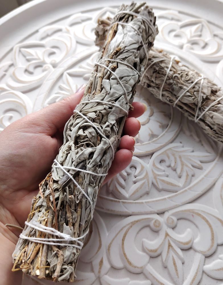Viljeltyä valkosalviaa Kaliforniasta. Tämä salviarulla on iso eli halkaisija n.4 cm ja pituus n.23 cm. Pieniä eroja voi olla tuotteiden välillä. Isompaan savutukseen sytytä koko rulla tai ota rullasta pienempiä oksia ja savuttele niillä. Muista käyttää alustaa nippusuitsukkeiden alla.