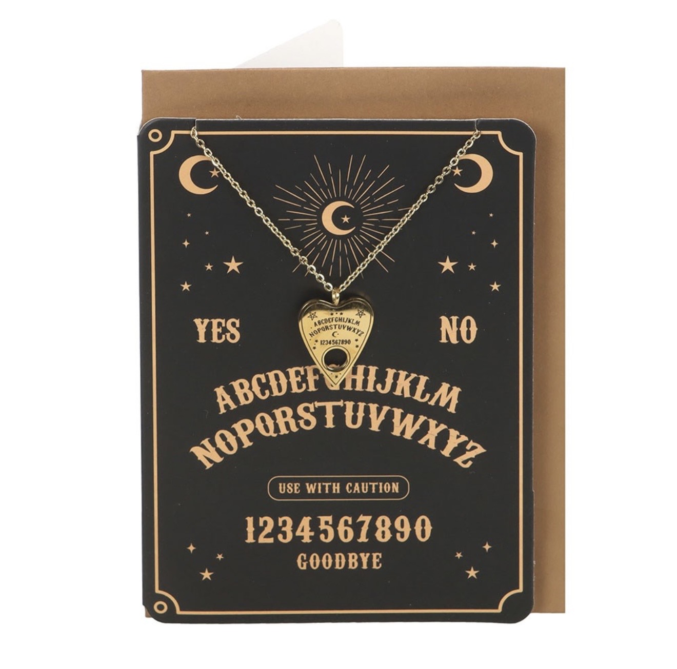 Mystinen lahjasetti joka sisältää nikkelittömän ja ruostumattoman kaulakorun henkilaudan osoitin- riipuksella sekä yhteinäisen kortin ja kirjekuoren. Kullanvärinen kaulakoru on pakattu kauniisti taitekorttiin jonka kannessa on henkilaudalle tyypillisiä merkintojä ja kuviointia. Tämä lahjasetti on moderni joka samalla huokuu mystisyyttä, ja jonka koru sopii niin arkeen kuin juhlaan. Loistava lahjaidea esim. nimipäivälahjaksi, syntymäpäivälahjaksi, ystävänpäivälahjaksi tai vuosipäivälahjaksi kaikille heille joita kiehtoo yliluonnollisuus ja henkimaailman kanssa kommunikointi.