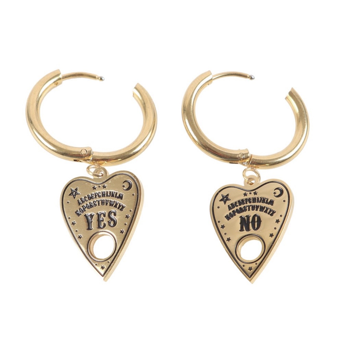 Kullanväriset ja mystiset nikkelittömät korvakorut joissa riippuu henkilaudan osoitin. Täydelliset korvakorut kaikille heille joita kiehtoo yliluonnollisuus ja henkimaailman kanssa kommunikointi.