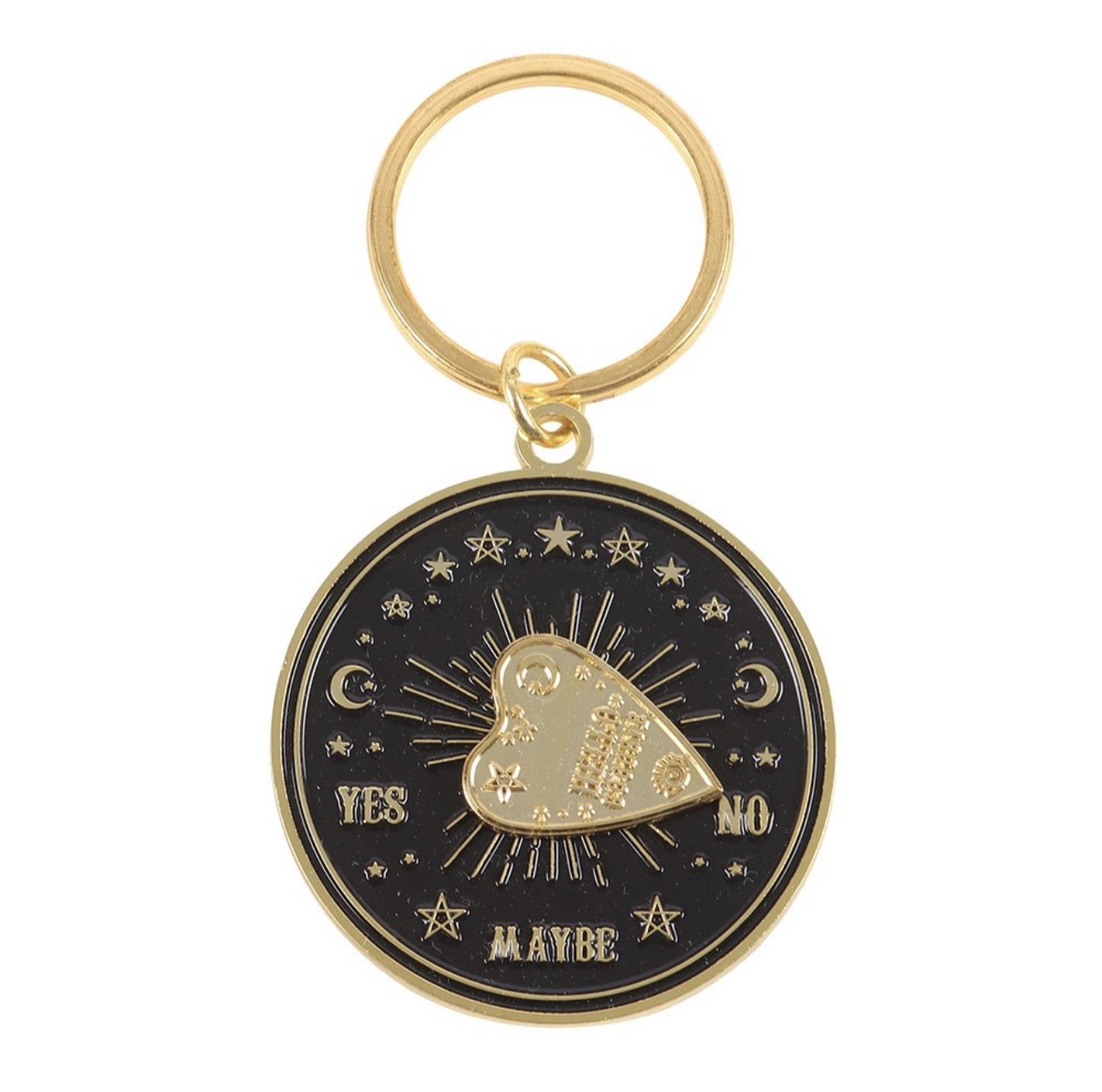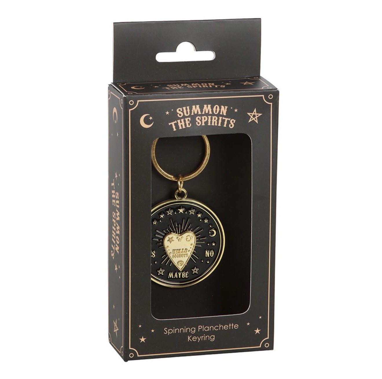 Kullanvärinen ja mystinen avaimenperä jossa on henkilaudan pyörivä osoitin. Avaimenperä toimitetaan tyylikkäässä mustassa lahjarasiassa. Täydellinen avaimenperä koristeeksi kaikille heille joita kiehtoo yliluonnollisuus ja henkimaailman kanssa kommunikointi.