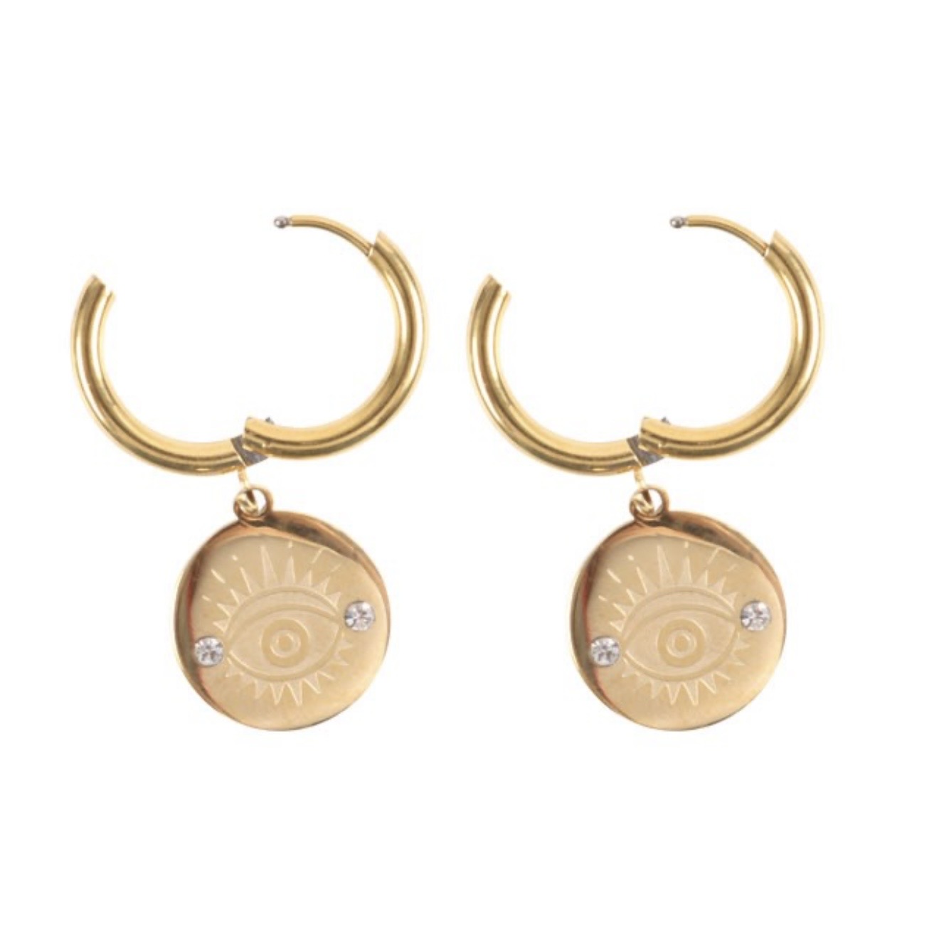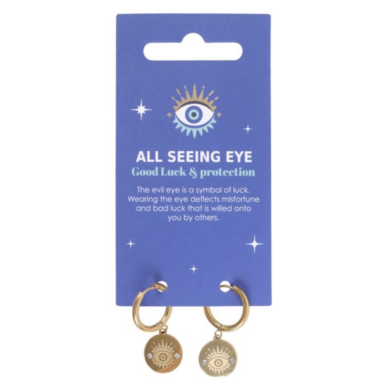 Kullanväriset ja paha silmä -aiheiset korvakorut joissa riippuu kaunis kaikennäkevä silmä. Nämä korvakorut tarjoavat tyylin lisäksi voimakasta suojaa kantajallensa negatiivista ajatusenergiaa vastaan.