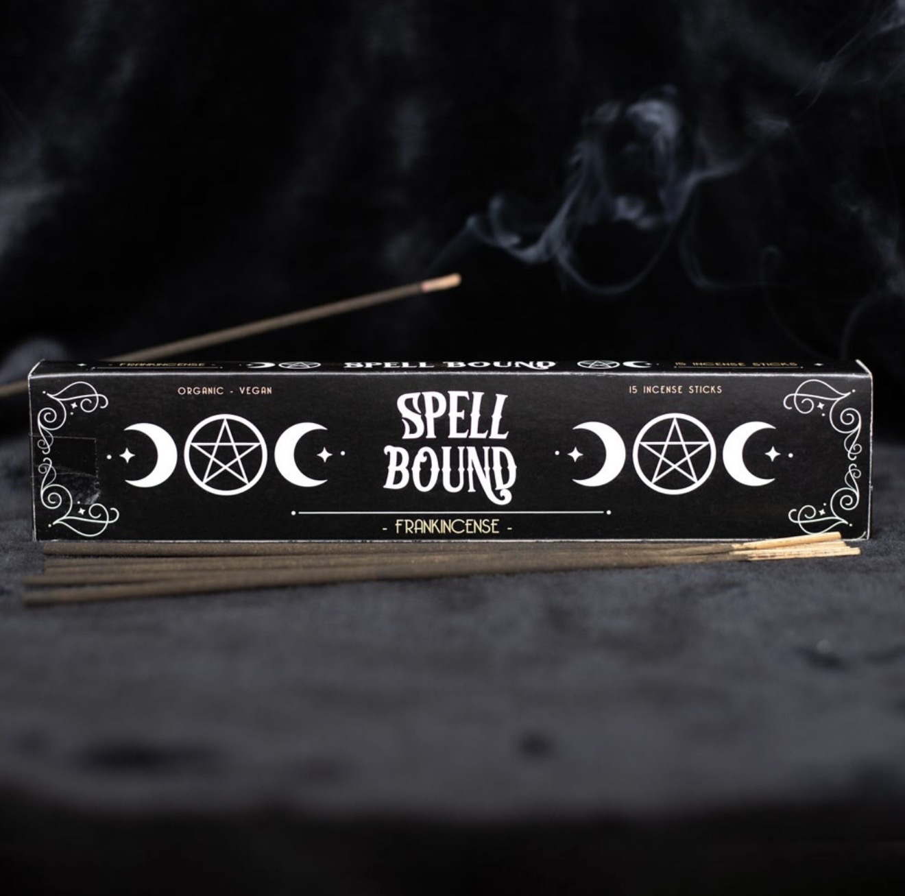 Nämä vegaaniset ja luomutuote -suitsukkeet ovat valmistettu käsin Intiassa käyttäen korkealaatuisimpia ainesosia ja tuoksuja. Spell Bound -suitsukepakkaus sisältää 15 kpl frankinsensin tuoksuisia suitsukkeita.