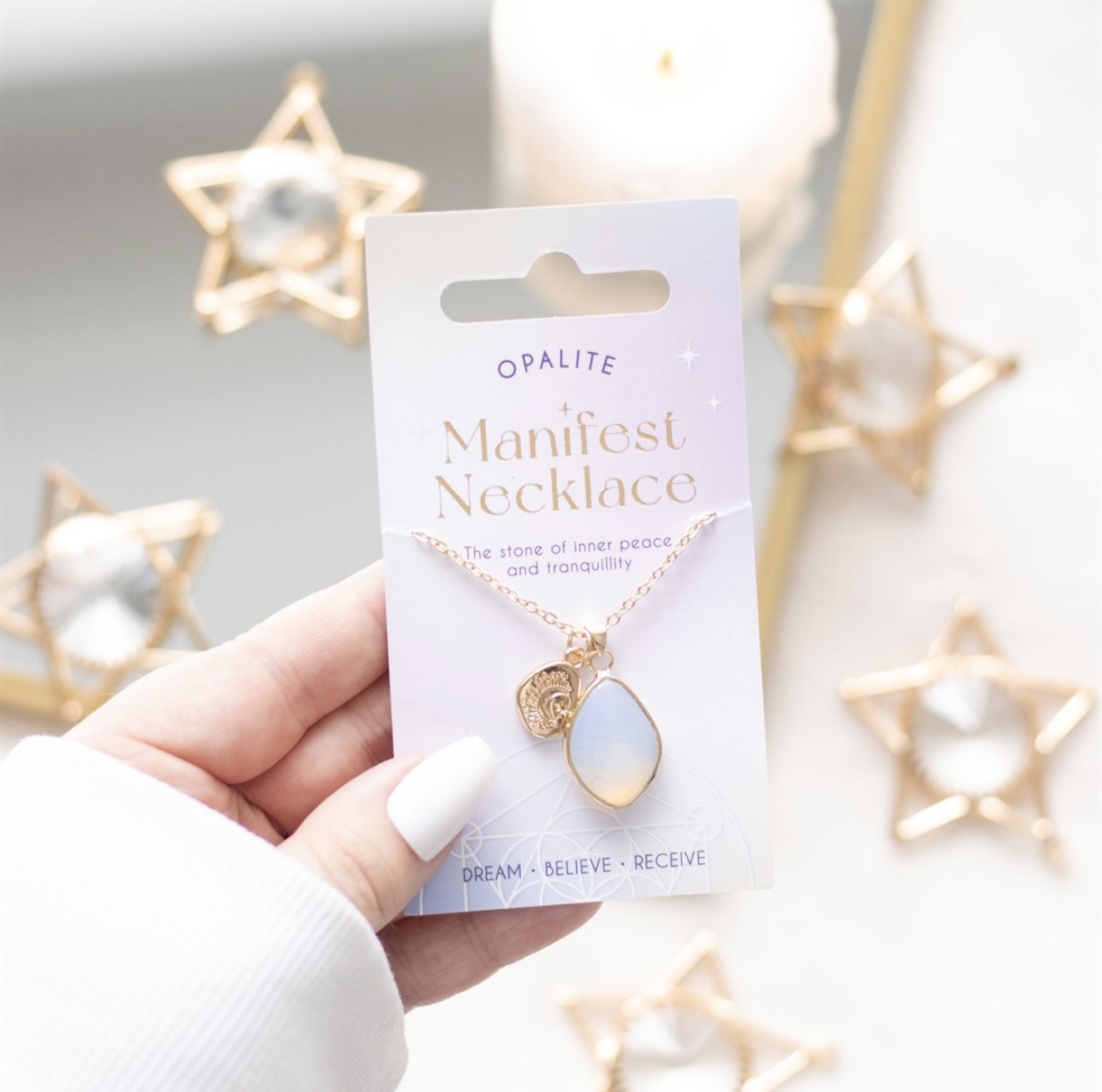 Kullanvärinen manifestaatio -kaulakoru jossa riipuksena kaunis opaliitti. Loistava koru unelmien tavoittelun tueksi.