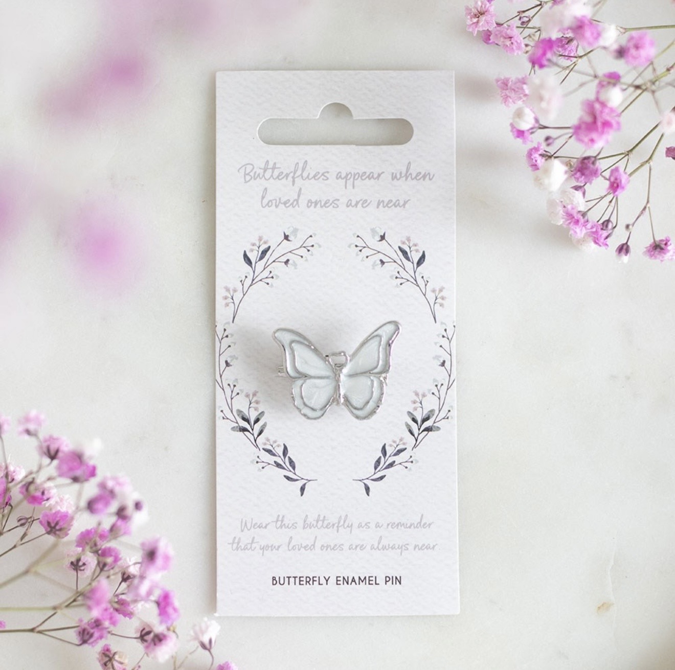 Herkkä, elegantinen ja muistoesine -aiheinen rintakoru/pinssi jossa koruna kaunis emaloidusta teräksestä valmistettu perhonen. Perhonen on vahva ja lohdullinen symboli mm. läheisen menetyksen yhteydessä, ja se yhdistetään usein sieluun, muodonmuutokseen sekä elämän jatkuvuuteen. Perhosen, erityisesti valkoisen, ilmestymisen uskotaan usein olevan viesti menehtyneeltä läheiseltä, joka kertoo olevansa rauhassa ja suojeluksessa.