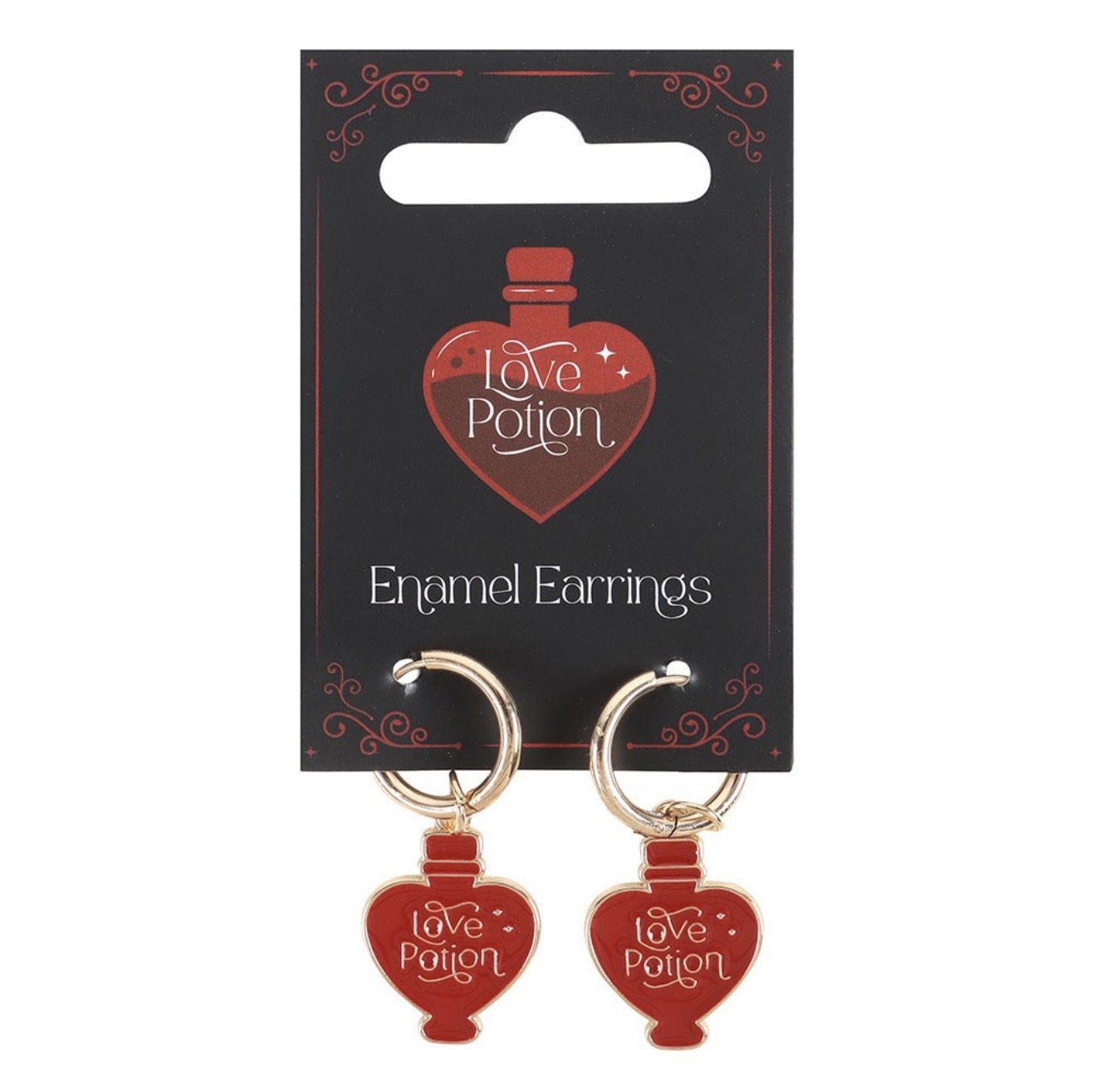 Kullanväriset ja rakkaus -aiheiset nikkelittömät korvakorut joissa riippuu romanttiset ja emaloidut punaiset lemmenjuoma -pullot. Pulloissa on kaunis englanninkielinen teksti "Love Potion" joka tarkoittaa suomeksi "Lemmenjuoma". Nämä leikkisät ja jopa viettelevät korvakorut ovat huomiota herättävä lisä mihin tahansa asuun niin arkeen kuin juhlaan kenelle tahansa.