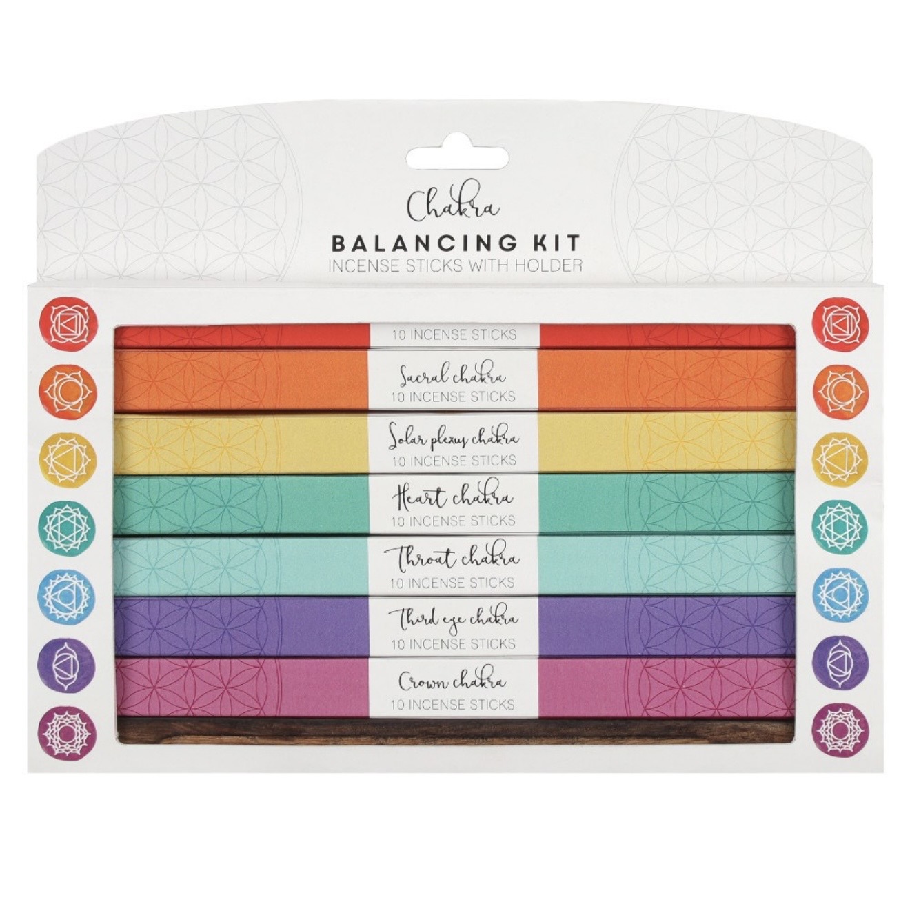 Chakroja tasapainottava suitsukesetti joka sisältää puisen tuhkankerääjän (suitsuketeline/-alusta) ja 7 yksittäistä 10 suitsukkeen pakkausta. Jokainen eri tuoksupakkaus edustaa yhtä seitsemästä chakrasta: