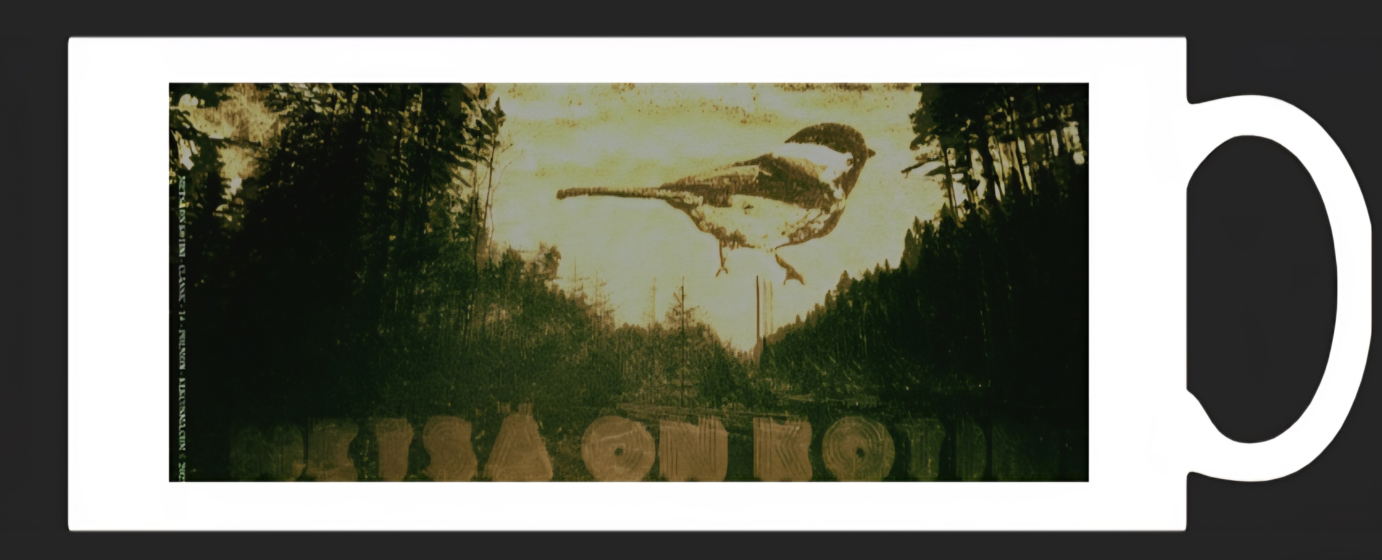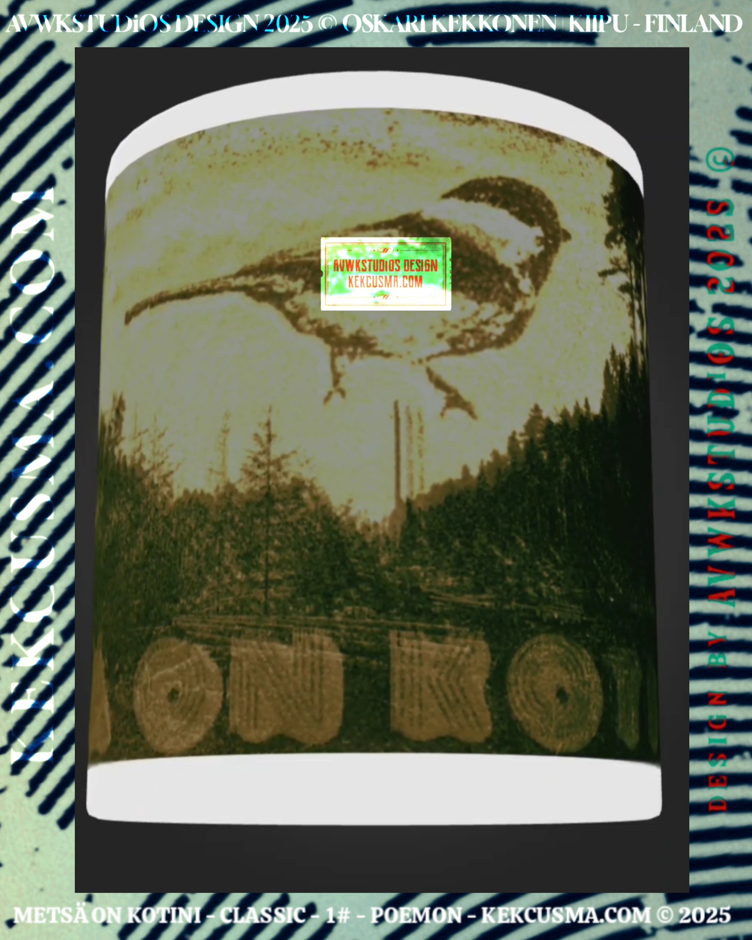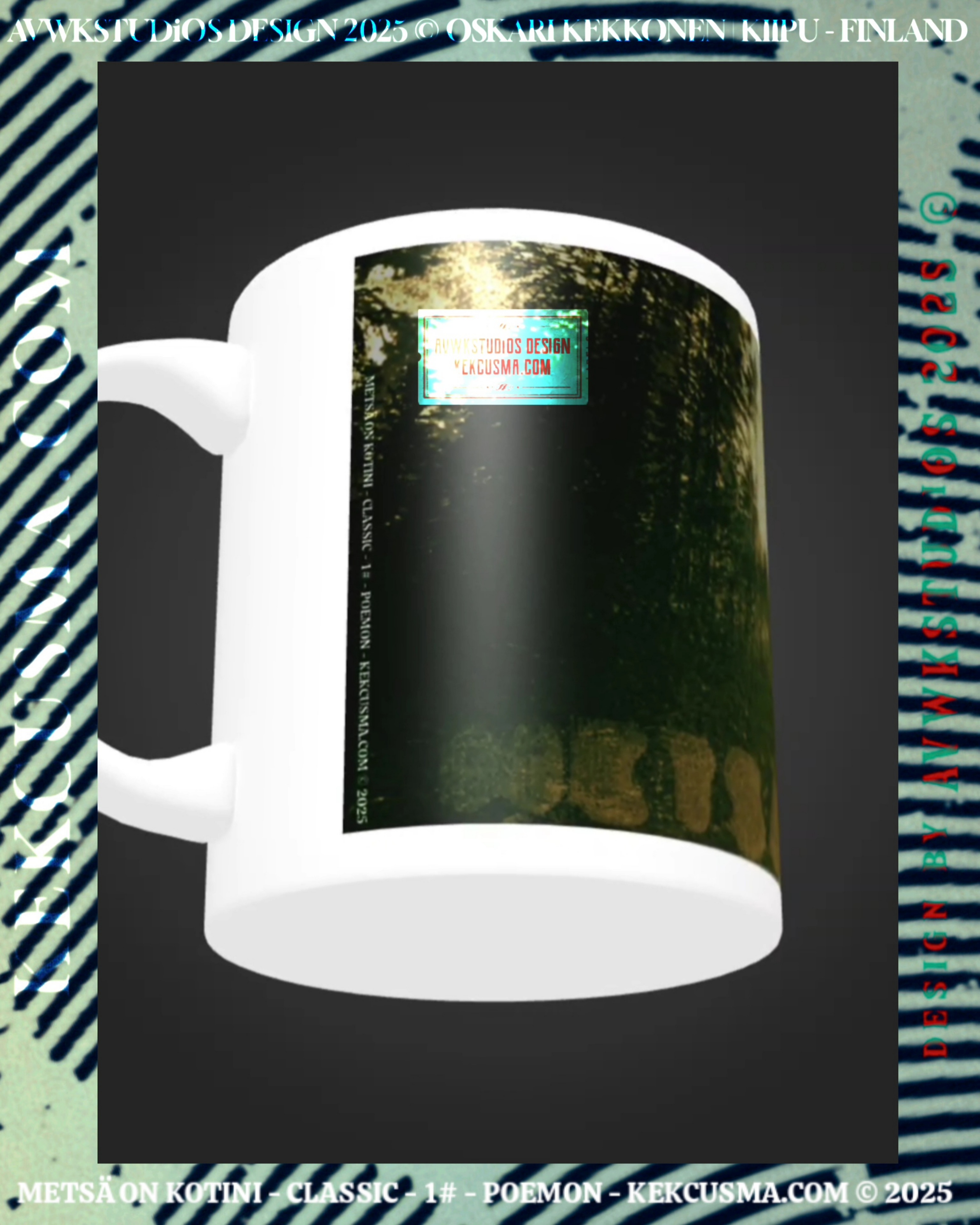 Teos pohjautuu sekatekniikkaan, jossa digitaalista valokuvaa maustetaan viivagrafiikalla. Edestä katsottuna mukin vasemmalla puolella on valmistajan, suunnittelijan printmark, mikä takaa, että tuote on aito. Suunnittelija: © Oskari Kekkonen / AVWKSTUDiOS 2025 - Kaikki oikeudet pidätetään - Teoksen luvaton kopiointi kielletty.