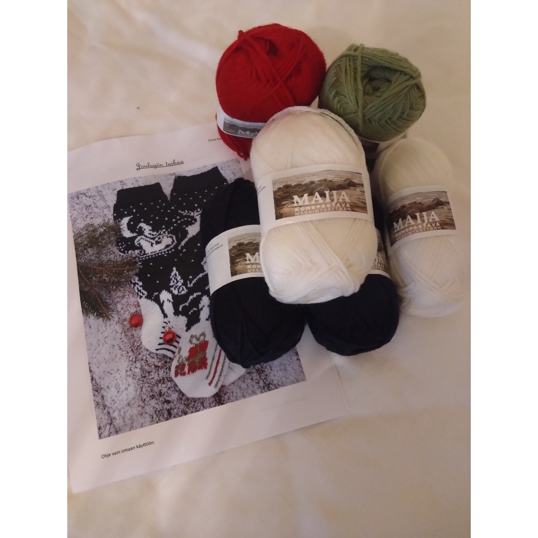 Jouluyön taikaa tuotepaketti sisältää langat pitkävartisiin sukkiin ja tulostetun neuleohjeen. Lankana on maija. Langat polyamidivahvisteisia ja konepesunkestäviä. Ohje on kirjoitettu 38/39 kokoiseen jalkaan, mutta helppo lisätä mittaa tarvittaessa. Työssä käytettävä sukkapuikkojen koko 3.00mm/ oman käsialan mukaan.