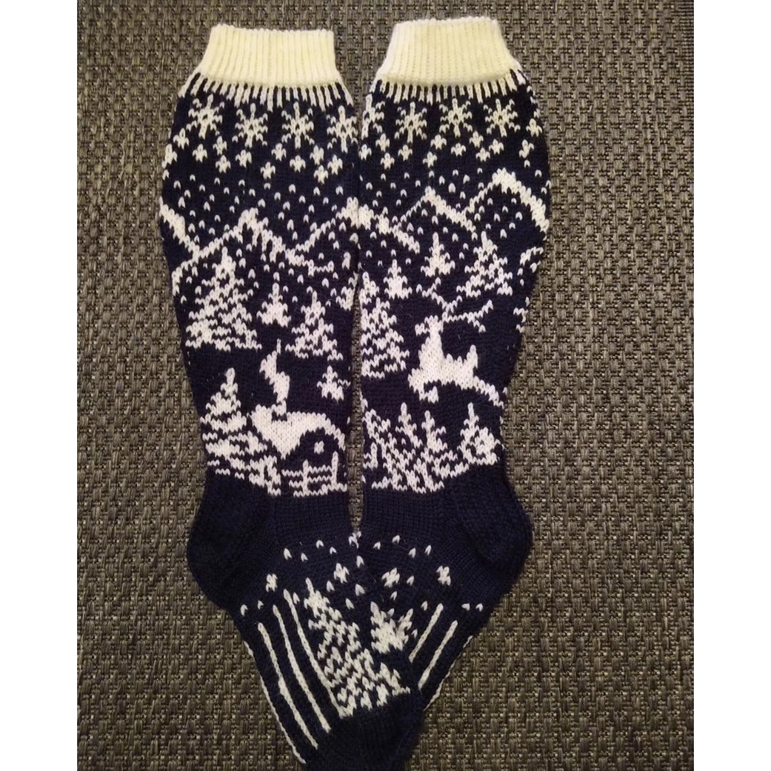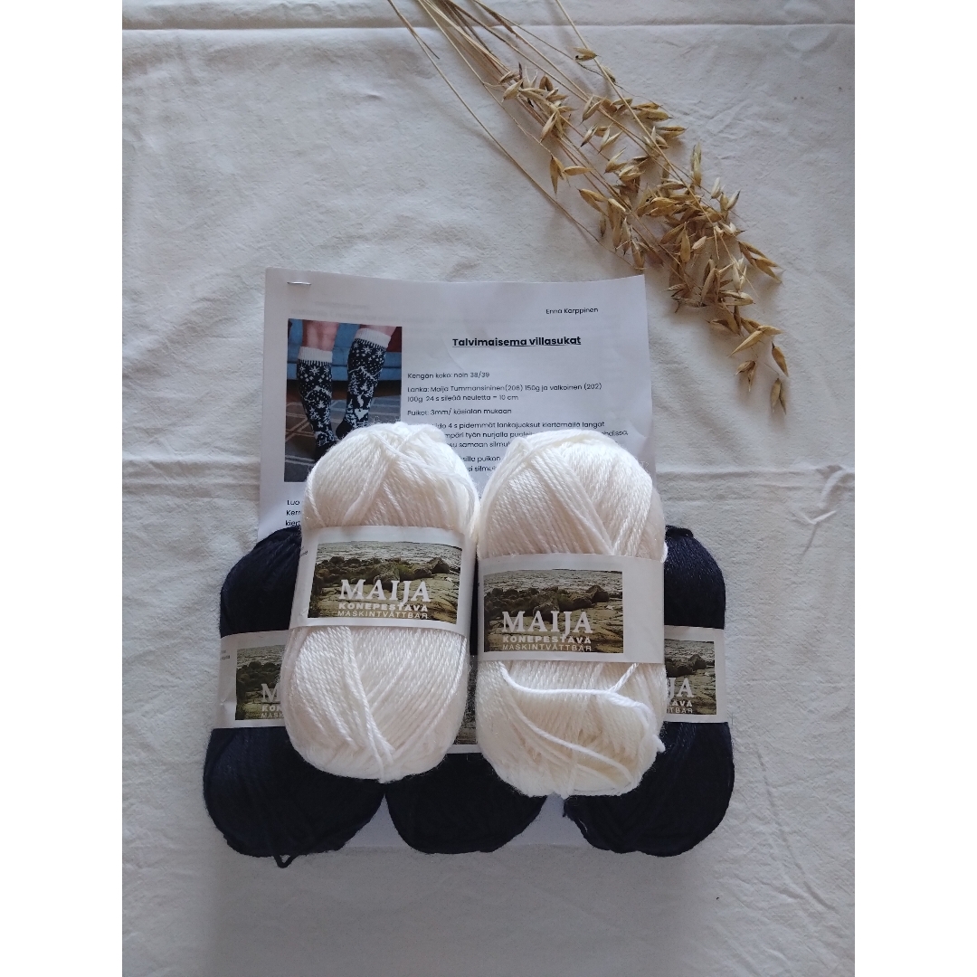 Talvimaisema tuotepaketti sisältää langat pitkävartisiin sukkiin ja tulostetun neuleohjeen. Lankoina on Maija. Langat polyamidivahvisteisia ja konepesunkestäviä. Ohje on kirjoitettu 38/39 kokoiseen jalkaan, mutta helppo lisätä mittaa tarvittaessa. Työssä käytettävä sukkapuikkojen koko 3,00mm/ oman käsialan mukaan.