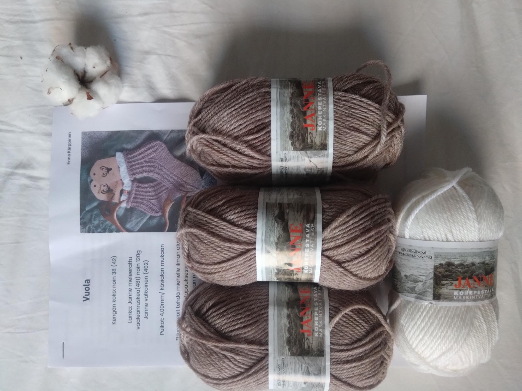 Vuola tuotepaketti sisältää langat perus vartisiin sukkiin ja tulostetun neuleohjeen. Lankana Janne. Lanka polyamidivahvisteista ja konepesunkestävä. Ohje on kirjoitettu 38/39 kokoiseen jalkaan, mutta helppo lisätä mittaa tarvittaessa. Työssä käytettävä sukkapuikkojen koko 3.50mm/ oman käsialan mukaan.