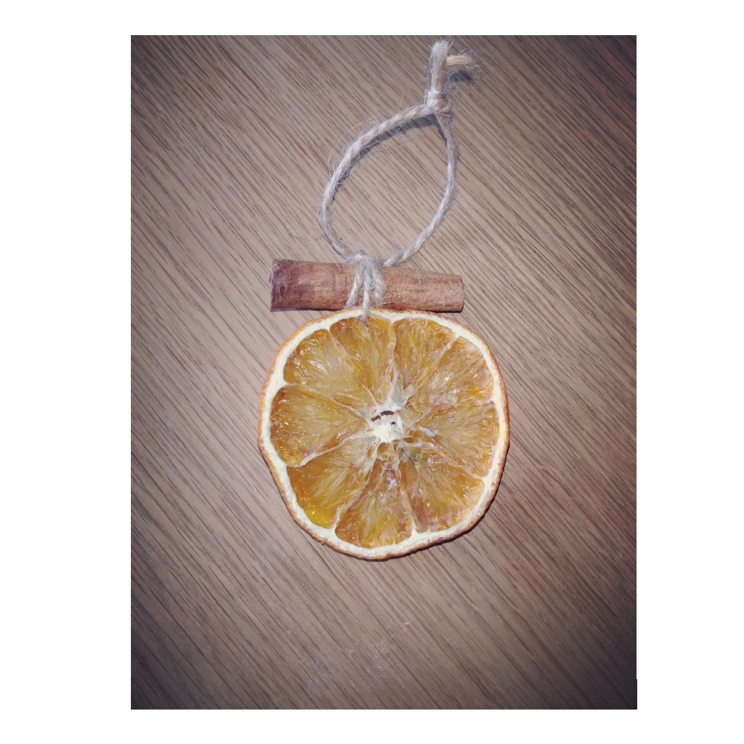 Kuivattu appelsiini, jossa kanelitanko ja ripustus naru juuttinarusta. (Jokainen kappale on unikki oma yksilönsä)