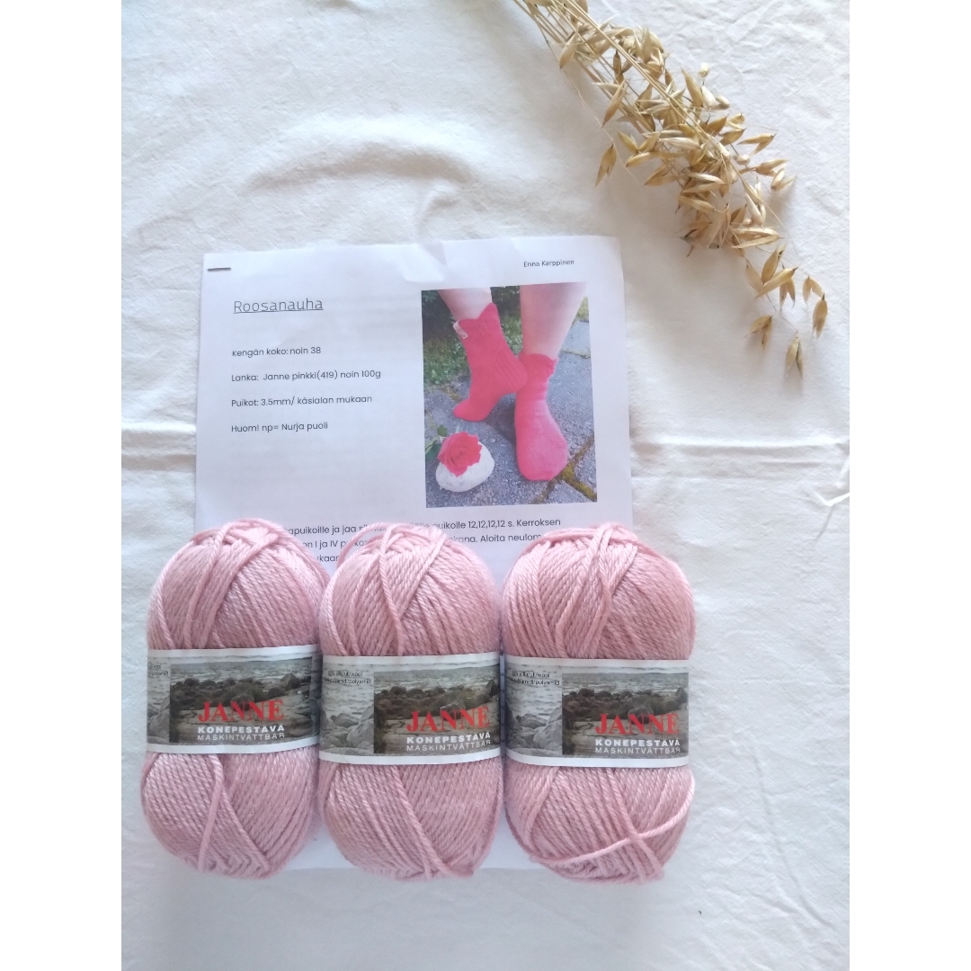Roosanauha tuotepaketti sisältää langat perus vartisiin sukkiin ja tulostetun neuleohjeen. Lankana Janne. Lanka polyamidivahvisteista ja konepesunkestävä. Ohje on kirjoitettu 38/39 kokoiseen jalkaan, mutta helppo lisätä mittaa tarvittaessa. Työssä käytettävä sukkapuikkojen koko 3.50mm/ oman käsialan mukaan.