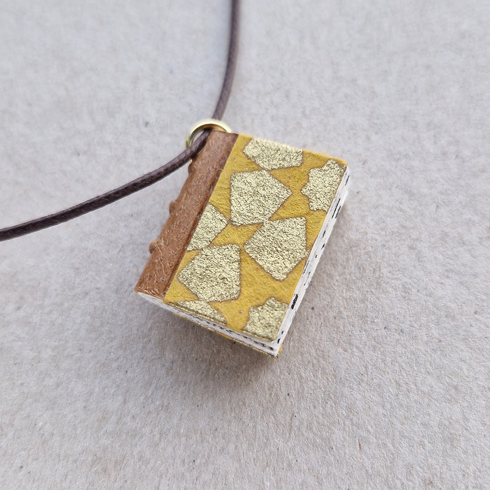 Kirjan selässä on beigeä vuohennahkaa ja kansissa nepalilaista käsintehtyä koristepaperia (sinapinkeltainen, himmeä kulta). Kullattu hopeinen lenkki ja kaulanauhana tummanruskeaa vahattua puuvillanyöriä.