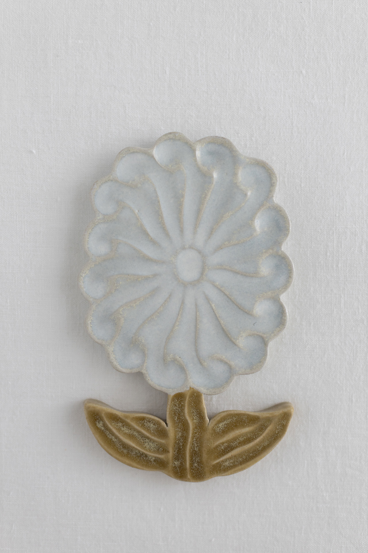 Ceramic wall relief. This elegant piece is crafted from stoneware clay and finished with two glazes (light blue & brown). H 18.5 cm × 11 cm × 1.5 cm. 2026.