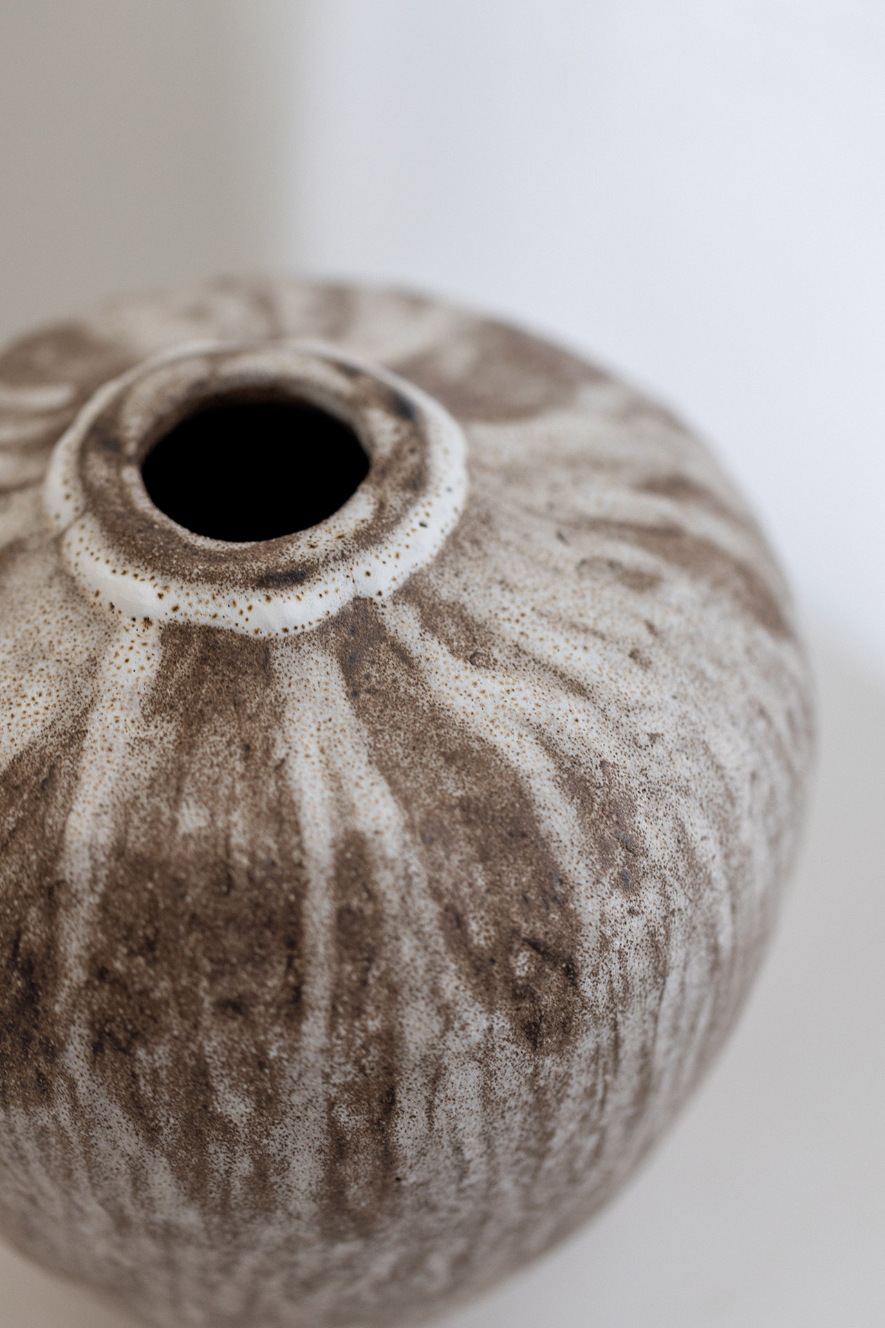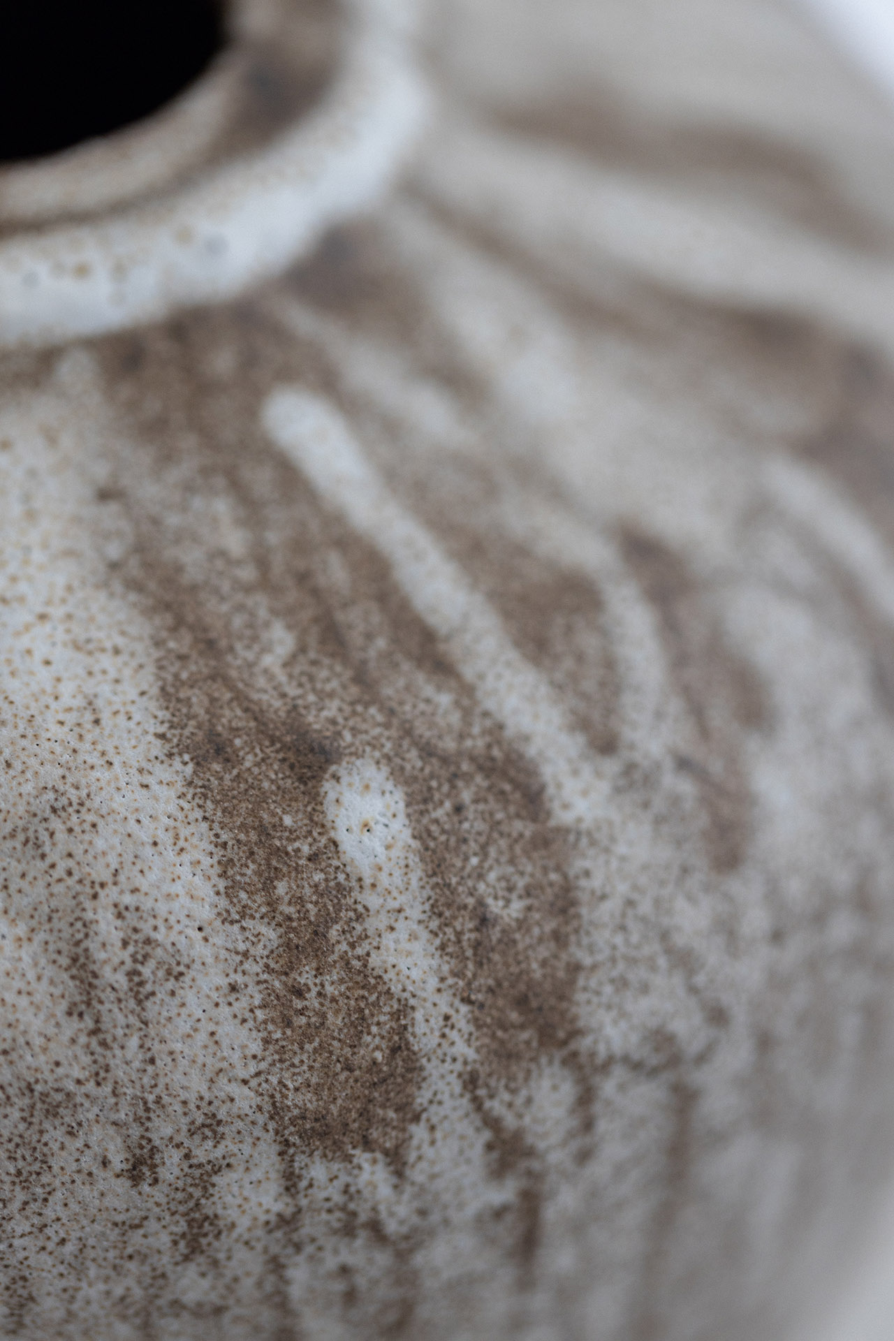Tummanruskea, kivitavarasavesta käsin valmistettu vaasi vaalealla, eläväisellä lasituksella. Lasitus on erilainen vaasin eri puolilla, myös sisäpuoli on lasitettu. K 18cm x L 17cm, 2024-2025. Pohjassa on signeeraus.