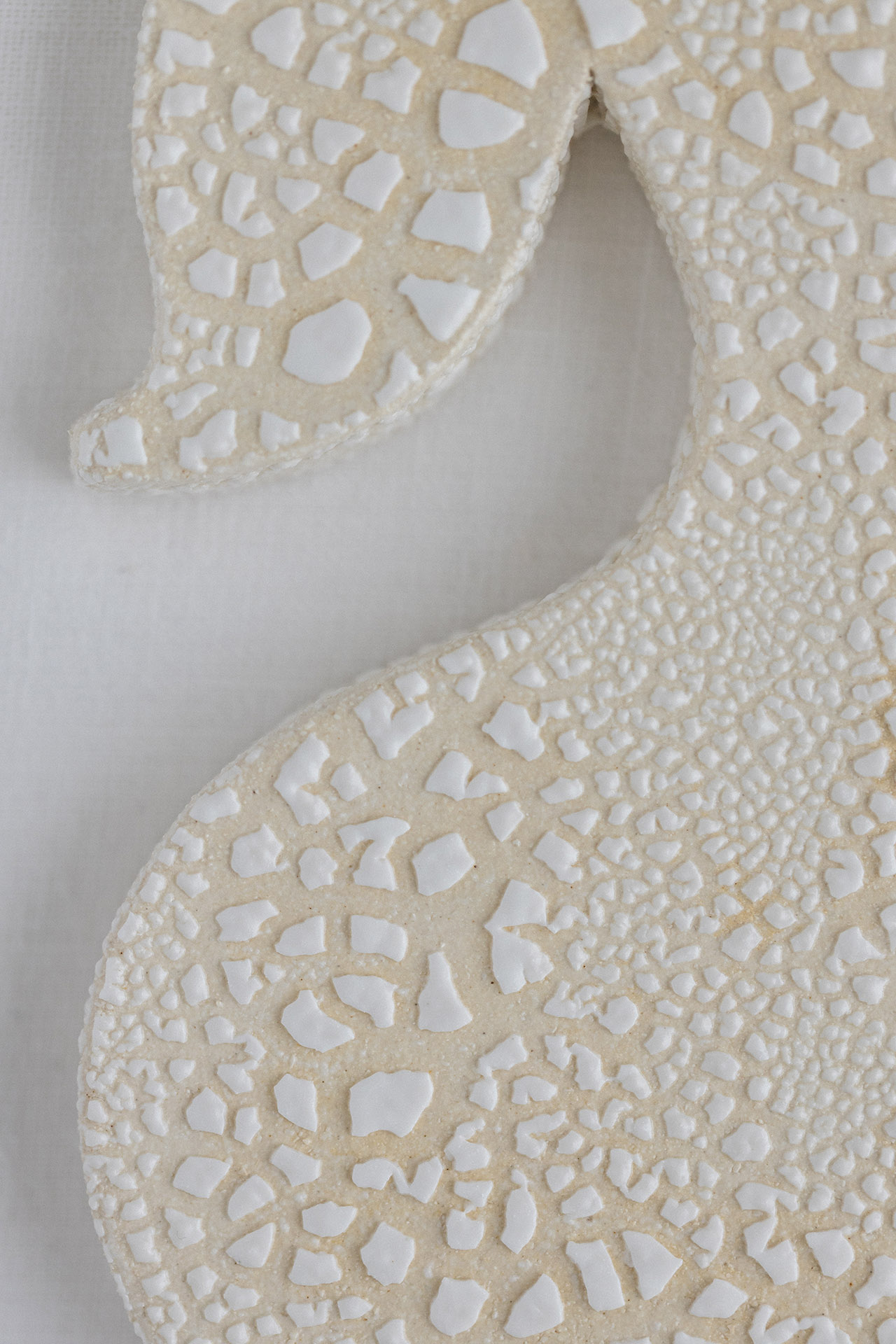 A delightful, fruit-inspired ceramic wall relief, handmade from stoneware clay. H 19.5 cm x W 12 cm, D 1.5 cm, 2025. Finished with a white effect glaze that allows the clay body to show through.