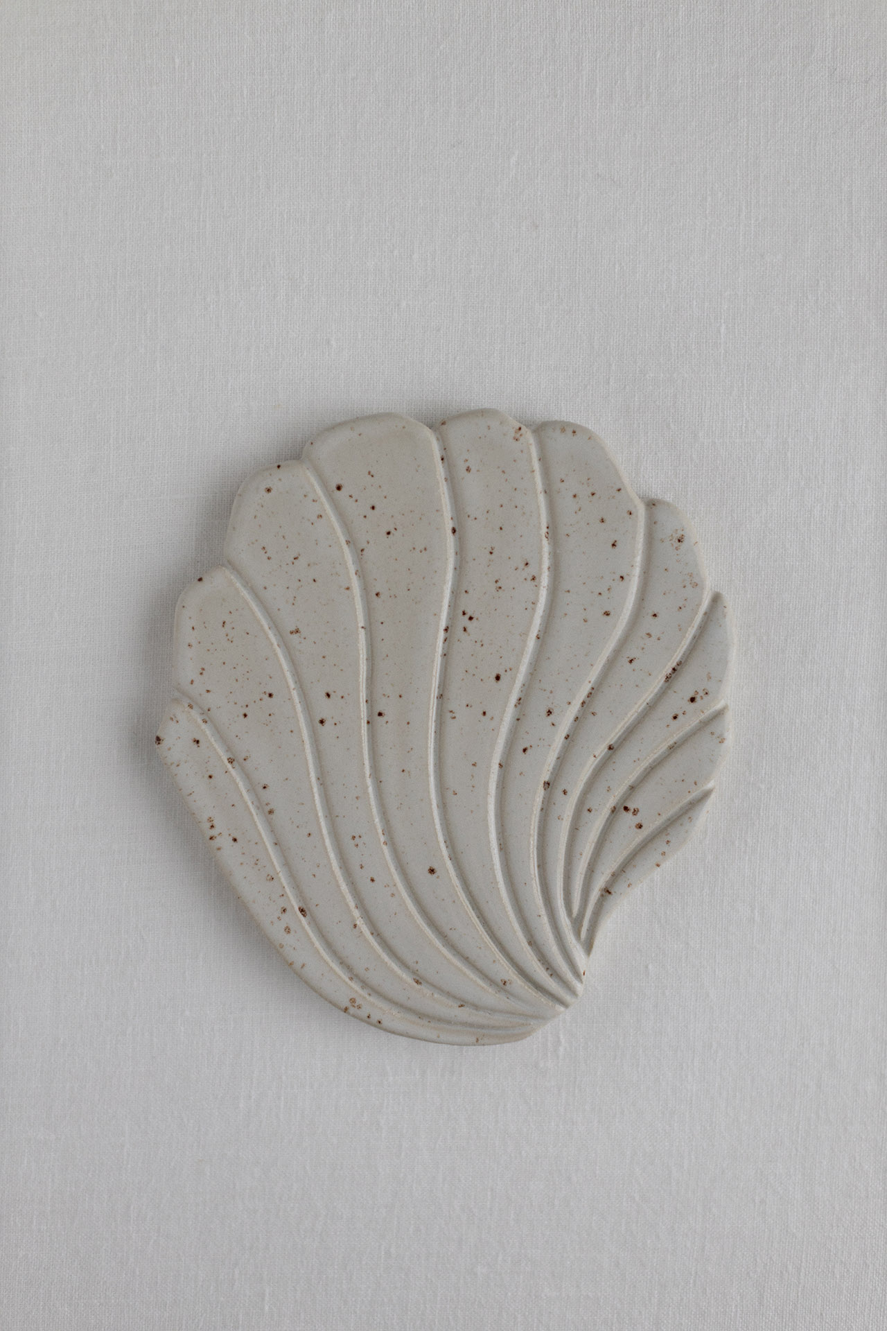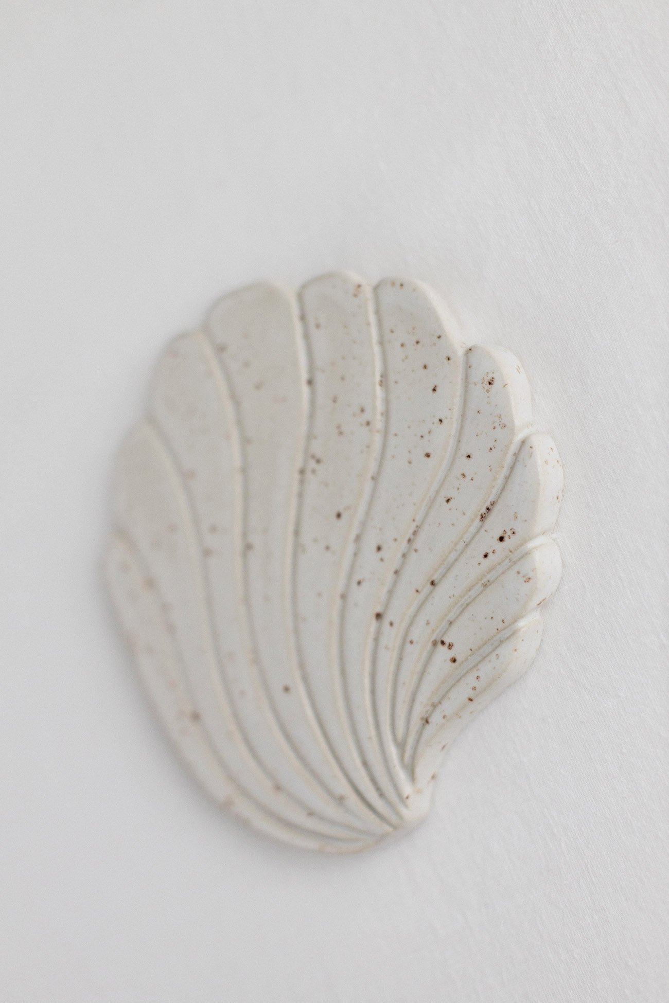 Keraaminen seinäreliefi, joka on saanut inspiraationsa ikuisesta ihastuksesta simpukoihin. 16cm x 14,5cm x 1,5cm, 2025. Kivitavarasavi, vaalea lasite, jossa ruskeita pilkkuja.