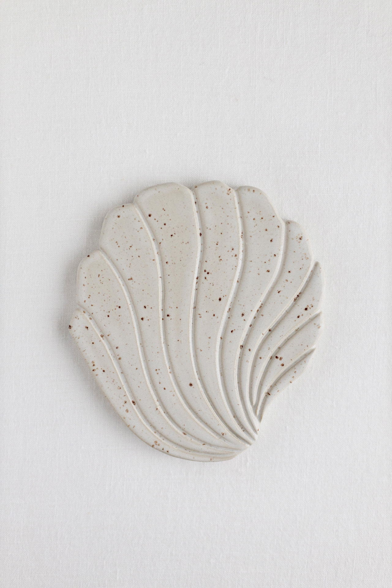 Ceramic wall relief inspired by a long-standing fascination with seashells. H 16 cm × W 14.5 cm × D 1.5 cm, 2025. Stoneware clay with a light glaze and subtle brown speckles.